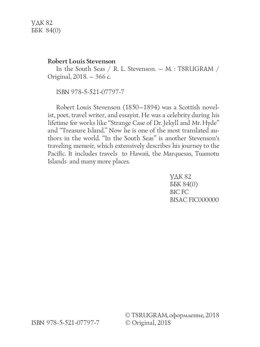 Handling time: 19 days Автор: Stevenson R.L., «In the South Seas = В Южных Морях: на англ.яз»: Robert Louis Stevenson (1850—1894) was a Scottish novelist, poet, travel writer, and essayist. He was a celebrity during his lifetime for works like "Strange Case of Dr. Jekyll and Mr. Hyde" and "Treasure Island." Now he is one of the most translated authors in the world. "In the South Seas" is another Stevenson's traveling memoir, which extensively describes his journey to the Pacific. It includes travels to Hawaii, the Marquesas, Tuamotu Islands and many more places.