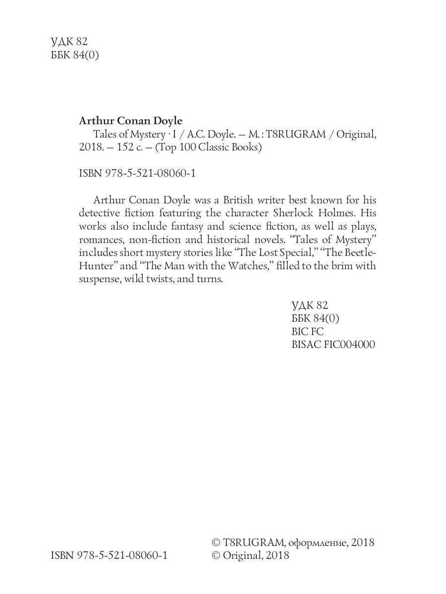 Handling time: 19 days Автор: Doyle Arthur Conan, «Tales of Mystery 1 = Рассказы о таинственном 1: на англ.яз»: Arthur Conan Doyle was a British writer best known for his detective fiction featuring the character Sherlock Holmes. His works also include fantasy and science fiction, as well as plays, romances, non-fiction and historical novels. "Tales of Mystery" includes short mystery stories like "The Lost Special," "The Beetle-Hunter" and "The Man with the Watches," filled to the brim with suspense, wild twists, and turns.