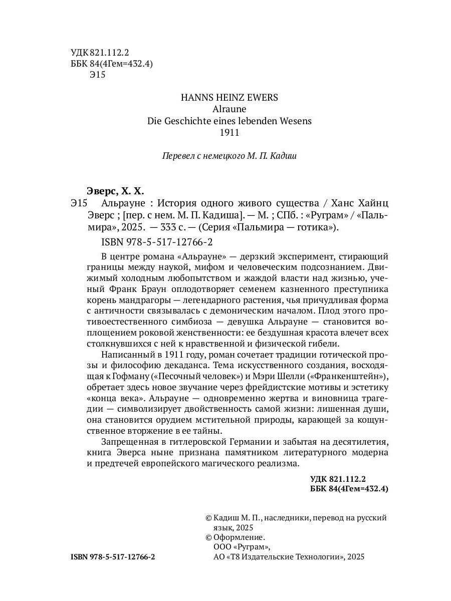 Handling time: 19 days Автор: Эверс Ханс Хайнц, «Альрауне: История одного живого существа»: В центре романа «Альрауне» — дерзкий эксперимент, стирающий границы между наукой, мифом и человеческим подсознанием. Движимый холодным любопытством и жаждой власти над жизнью, ученый Франк Браун оплодотворяет семенем казненного преступника корень мандрагоры — легендарного растения, чья причудливая форма с античности связывалась с демоническим началом. Плод этого противоестественного симбиоза — девушка Альрауне — становится воплощением роковой женственности: ее бездушная красота влечет всех столкнувшихся с ней к нравственной и физической гибели. Написанный в 1911 году, роман сочетает традиции готической прозы и философию декаданса. Тема искусственного создания, восходящая к Гофману («Песочный человек») и Мэри Шелли («Франкенштейн»), обретает здесь новое звучание через фрейдистские мотивы и эстетику «конца века». Альрауне — одновременно жертва и виновница трагедии — символизирует двойственность самой жизни: лишенная души, она становится орудием мстительной природы, карающей за кощунственное вторжение в ее тайны. Запрещенная в гитлеровской Германии и забытая на десятилетия, книга Эверса ныне признана памятником литературного модерна и предтечей европейского магического реализма.