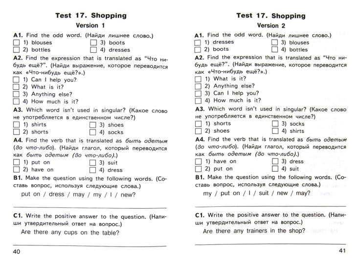 Контрольно-измерительные материалы (КИМы) разработаны для младших школьников, изучающих английский язык. В пособие вошли лексико-грамматические тесты, тесты по чтению и аудированию, а также тематические контрольные работы. Все задания соответствуют программе общеобразовательных учреждений и требованиям ФГОС для начальной школы. В конце пособия ко всем заданиям приведены ответы.Издание адресовано учителям английского языка, школьникам и их родителям.РЕКОМЕНДУЕМ: Английский язык. Разноуровневые задания. 4 класс Цена: 104.00 руб. шт. Автор(ы): Кулинич Г.Г.Количество страниц: 80ISBN: 978-5-408-03846-6Формат: 70х100/16 (165x235 мм)Переплет: обложкаСодержание От составителя Test 1. Seasons Test 2. Speaking about the future Test 3. Describing your house Test 4. What is there in your room? Test 5. Country Test 6. Сity Test 7. Adjectives Test 8. People and animals Test 9. Past Simple Test 10. The verb to be Test 11. Verbs in Past Simple Test 12. Verbs in Past Simple Test 13. Help your family Test 14. Time Test 15. Be polite Test 16. Shopping Test 17. Shopping Test 18. Shopping Test 19. Sсhool Test 20. Sсhool Приложения Reading Tests (Тесты по чтению) Listening Tests (Tесты по аудированию) Тематические контрольные работы Ключи к тестам Ключи к тестам по чтению Ключи к тестам по аудированию Ответы к тематическим контрольным работамОзнакомительный фрагментКИМ для iPhoneКИМ для AndroidПриобрести электронное изданиеМожно терять время в поисках, где скачать бесплатно, а можно купить эту книгу прямо сейчас!load_event: page_load widget_id: Kg92rtOr3Q41csx3L19j book_author: Кулинич Г.Г.book_name: Контрольно-измерительные материалы. Английский язык. 4 классbook_isbn: 978-5-408-03846-6 Другие книги серии:Физическая культура. Входные и итоговые проверочные работы. 1–4 классы Контрольно-измерительные материалы. Финансовая грамотность. 4 класс Контрольно-измерительные материалы. Литературное чтение. 4 класс Контрольно-измерительные материалы. Русский родной язык. 4 класс Контрольно-измерительные материалы. Информатика. 4 класс Контрольно-измерительные материалы. Русский язык. 4 класс Контрольно-измерительные материалы. Математика. 4 класс Контрольно-измерительные материалы. Литературное чтение на родном русском языке. 4 класс Контрольно-измерительные материалы. Окружающий мир. 4 класс