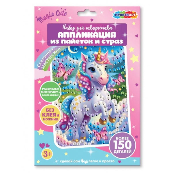 Аппликация из пайеток и страз 17*23 см в пак единорог МУЛЬТИ АРТ в кор.100шт