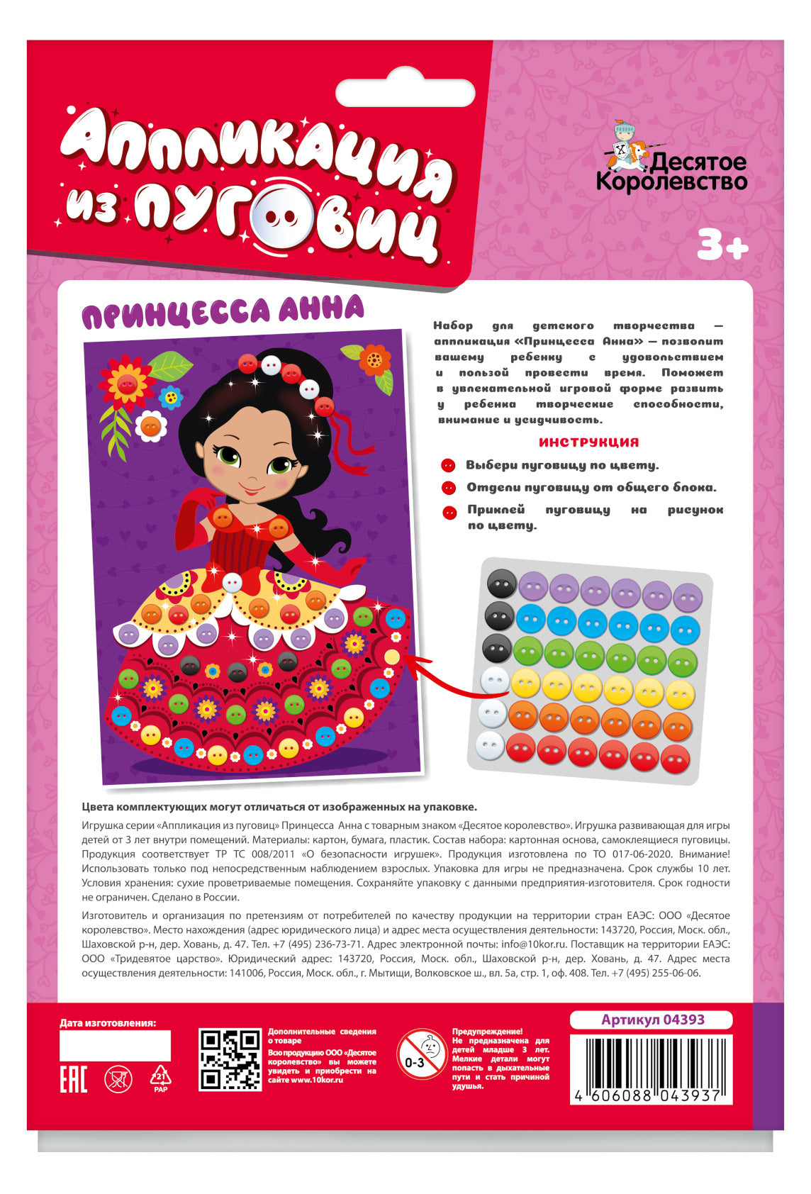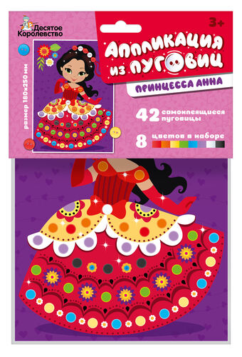 Handling time: 24 days Состав набора: цветная картинка-основа – 1 шт. (15,8 х 20 см), цветные пуговицы, 8 цветов – 38 шт. (диаметр 1 см.). Возраст: от 3 лет. Материал: пластик, картон. Набор Аппликация из пуговиц «Принцесса Анна» развивает творческие способности ребёнка, внимание, усидчивость и мелкую моторику.