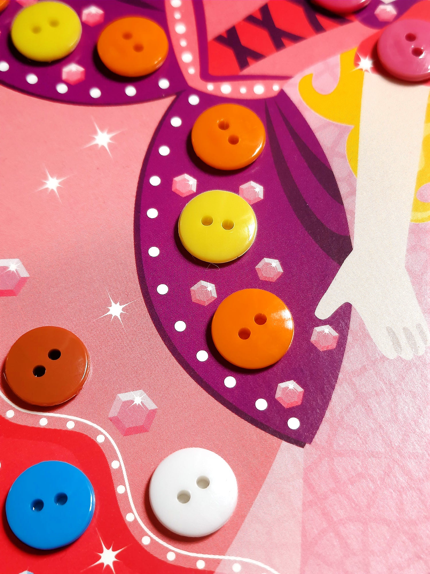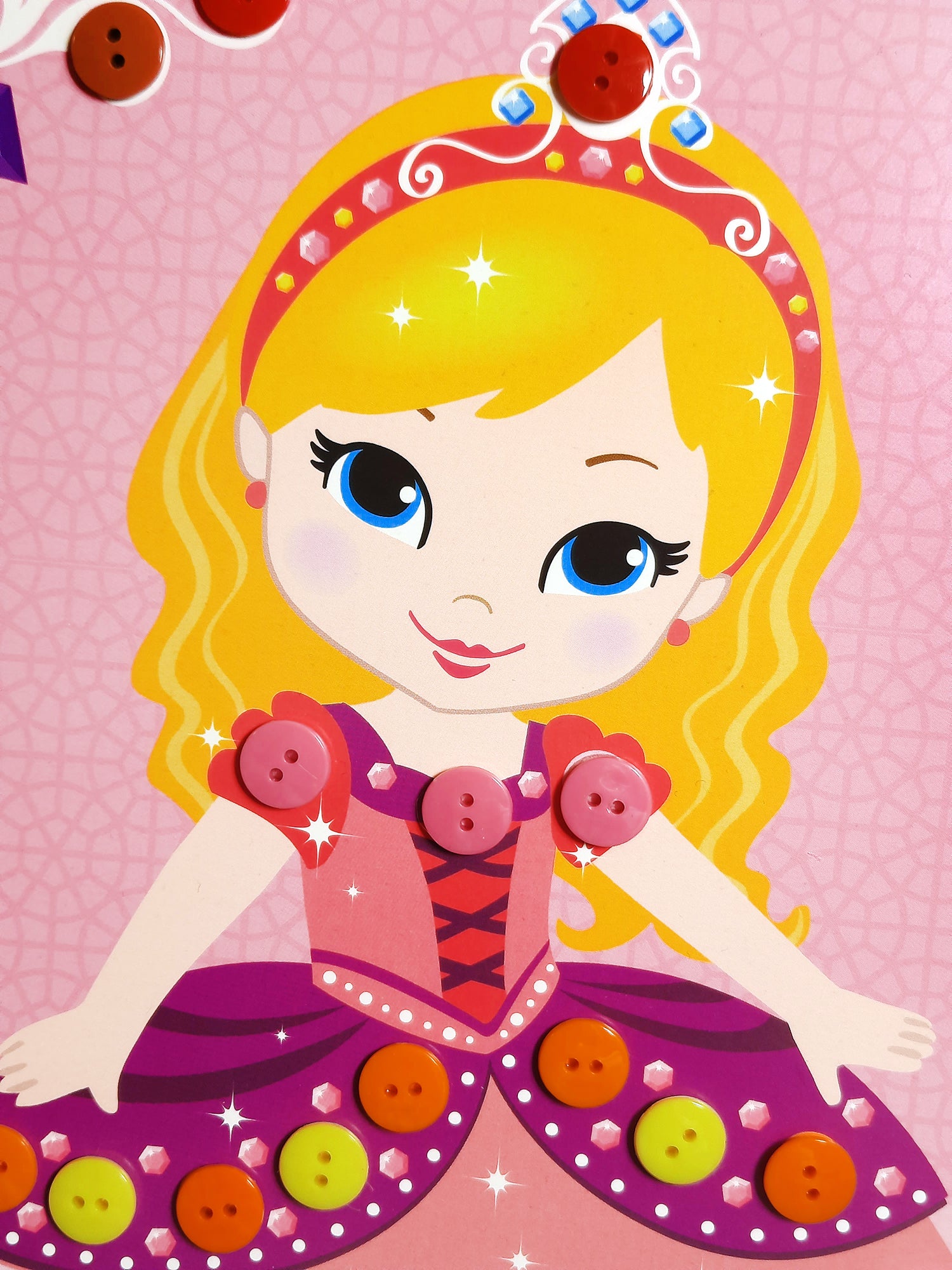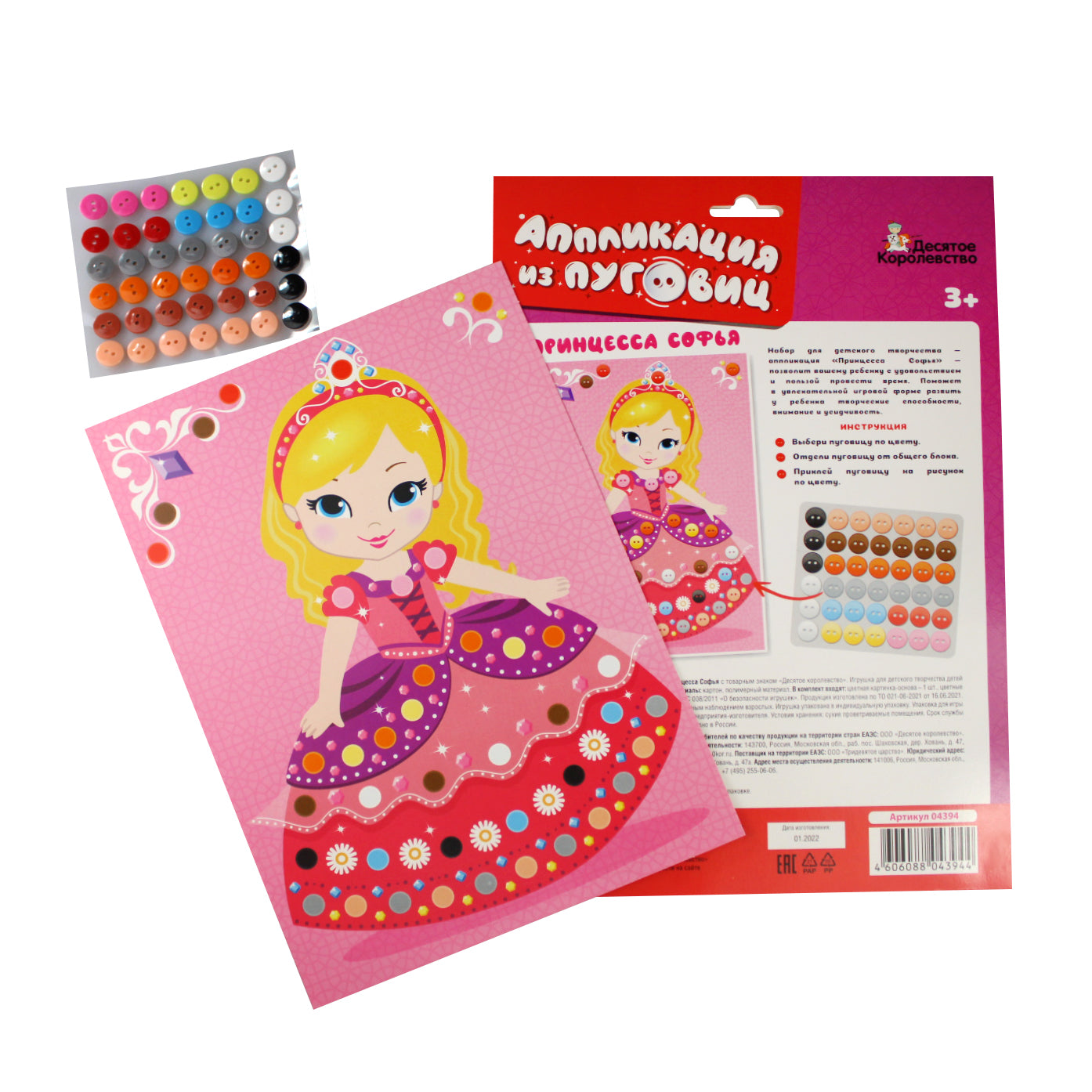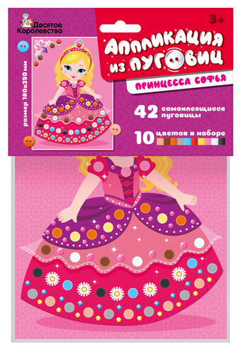 Handling time: 24 days Аппликация из пуговиц «Принцесса Софья». Состав: цветная картинка-основа – 1 шт. (18 х 25 см), цветные пуговицы, 10 цветов – 42 шт. (диаметр 1 см.)Возраст: от 3 лет. Материал: картон, пластик. Набор развивает творческие способности ребёнка, внимание, усидчивость и мелкую моторику.