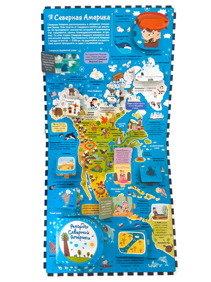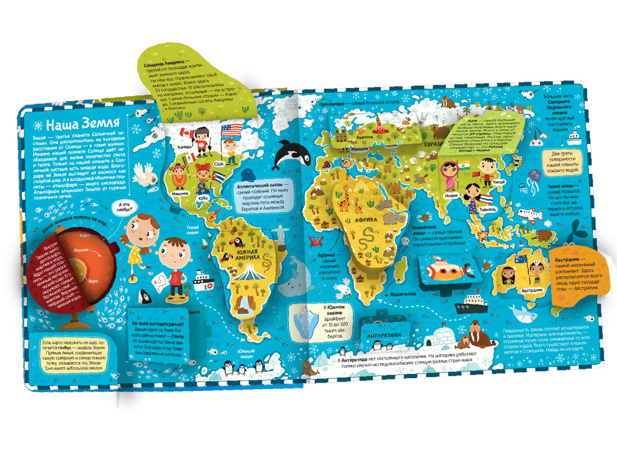 Большая энциклопедия. Атлас. Путешествие по материкам Книга «Атлас. Путешествие по материкам» из серии «Большая энциклопедия» — это настоящий атлас мира для вашего малыша. Вместе с персонажами-путешественниками на страницах книги он посетит каждый материк, узнает о нём много интересных фактов, познакомится с флорой и фауной, самыми интересными и знаменитыми достопримечательностями. Во вложении к энциклопедии — большая карта мира, по которой удобно изучать государства и флаги. Красочные иллюстрации, сотни открывающихся окошек, интересные факты ...
