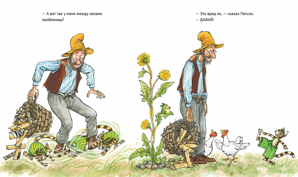 «А ну-ка, Петсон, — крикнул Финдус, — допрыгнешь отсюда до дома на двух ногах?» «Думаю, да, только неохота», — сказал Петсон. Пока старик Петсон занимается хозяйством, котенок Финдус развлекается как может: то запутается в его ногах, то начнет гонять кур. Петсон постепенно втягивается в его развлечения — вот он тоже распугивает кур, а вот лезет на дерево, как в детстве. Наконец, старик и котенок отправляются на остров на озере и устраивают там пикник.Для кого:Для чтения взрослыми детям в возрасте от 2 лет.О серии:Серия книг про старика Петсона и его друга-котенка Финдуса, живущих в деревне, была придумана шведским художником Свеном Нурдквистом в 1984 году. С тех пор об этих героях узнал весь мир: книги переведены на множество языков.Книги о Петсоне и Финдусе стали новой детской классикой. По ним ставят спектакли, делают компьютерные игры, приложения, раскраски, календари и подарочные наборы. На них выросло не одно поколение детей в Швеции и России.Отзыв критика:Я влюбилась в Нурдквиста именно за его иллюстрации, смешные и трогательные. Они возвращают напрямую в наше собственное детство: помните, как это — лечь в траву и представить себя маленькой, живущей в травяном лесу? Все листья, жучки и муравьи оказываются соразмерны тебе, и столько всего открывается в этом крохотном мире! Примерно это и происходит, когда смотришь иллюстрации Нурдквиста — каждая страница являет собой такой мирок. Кроме главных действующих героев, которые очень характерны, буквально каждая букашка, каждый цветок живет своей жизнью и тоже имеет характер. Екатерина Голубева. «Папмамбук»Об авторе:Свен Нурдквист родился в городе Хельсингборге. Уже в пятнадцать лет он знал, что будет художником. Поэтому, учась на архитектора, он одновременно ходил на курсы по искусству и рисованию. Поначалу Свен Нурдквист создавал иллюстрации к школьным учебникам. А от учебников недалеко и до детских книг. Работы Нурдквиста участвуют во многих международных выставках.