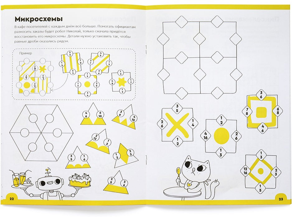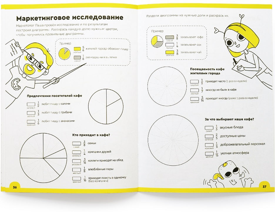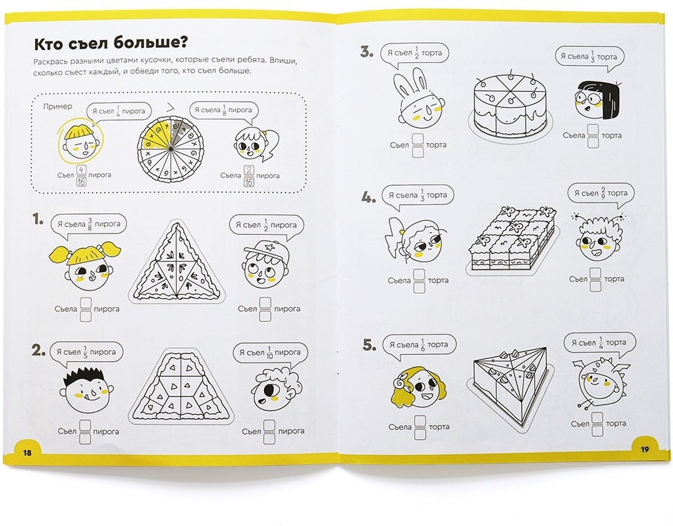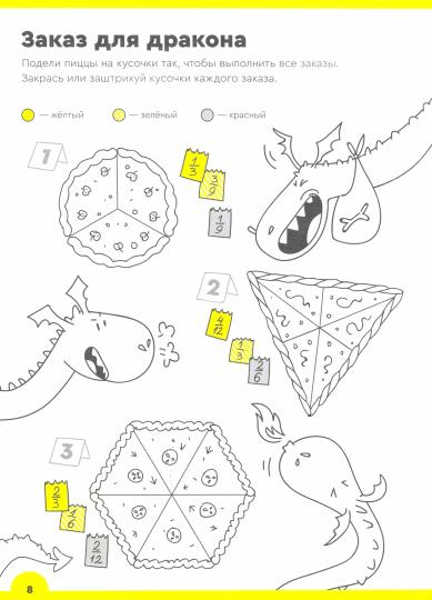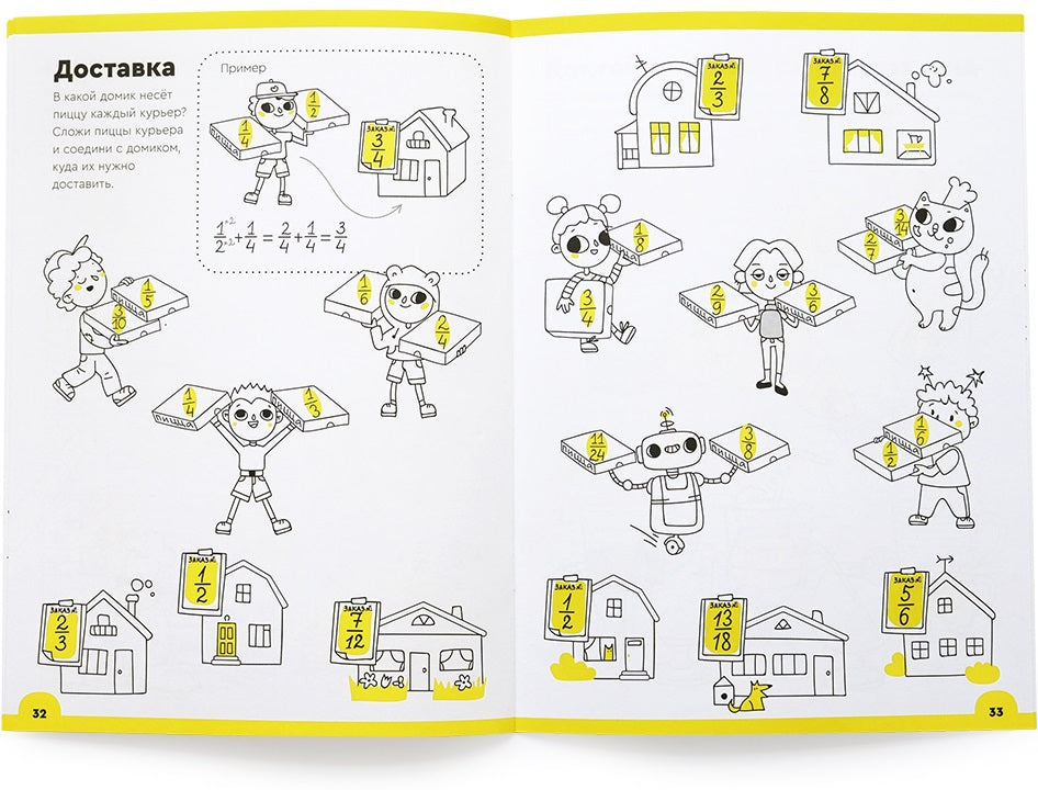 Увлекательные задания интересно объясняют принципы сложения и вычитания дробей. Решая примеры с помощью наглядных кусочков пиццы и пирогов, дети учатся производить операции с числовыми дробями.Секрет понимания долей и дробей в поэтапном освоении. Нет никакого смысла объяснять даже простые операции с дробями без понимания того, как они устроены, и чем вообще 2/3 отличается от 3/2. А с пиццей и пирогами на страницах тетради это получится не только легко, но ещё и так вкусно!С этой тетрадью дети научатся приводить дроби к общему знаменателю, складывать и вычитать их между собой.В тетради вас ждут интересные сюрпризы и зашифрованные задания!