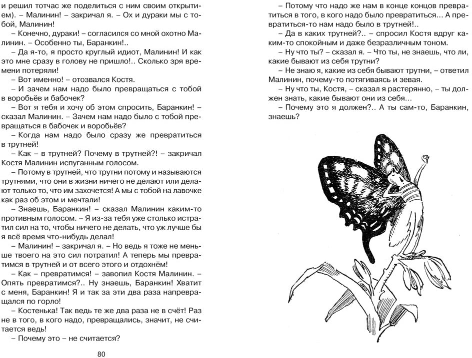 Handling time: 14 days Баранкин, будь человеком!. Медведев В. Чтение-лучшее учение У школьников непростая жизнь, а у двоечников и подавно! Вот и Юра Баранкин вместе с Костей Малининым в свой единственный выходной – воскресенье – вынуждены исправлять оценки и работать в школьном саду. А у кого-то каждый день выходной! Так думал Юра, наблюдая за весёлыми воробьями и беззаботно порхающими бабочками. Вот бы стать воробьём! А если очень сильно захотеть, то желание обязательно исполнится!
