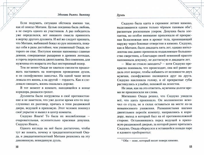 Handling time: 19 days Двое пылких мужчин устраивают изощрённый поединок за любовь прекрасной Сидзуко Хатаянаги. Обоим дуэлянтам удаётся избежать смерти, однако зрелый джентльмен Митихико Окада, выживший лишь благодаря милости юного Фусао Митани, не выдерживает позора и сводит счёты с жизнью. Это трагичное происшествие становится началом вереницы чудовищных преступлений, которые мучительным бременем ложатся на некогда процветающую семью Сидзуко. Но кто же стоит за всеми зверствами? Таинственный недоброжелатель, затаивший обиду на госпожу Хатаянаги? Или же Вампир — уродливое чудовище без губ, необъяснимым образом проникшее в дом Сидзуко?.. Эдогава Рампо является первым японским писателем, целиком посвятившим своё творчество жанру детектива. На родине он известен не только как автор, но и как литературный критик, создатель Ассоциации писателей детективов и учредитель премии для авторов детективных произведений. Также Эдогава Рампо был удостоен Медали почёта с пурпурной лентой и других правительственных наград.