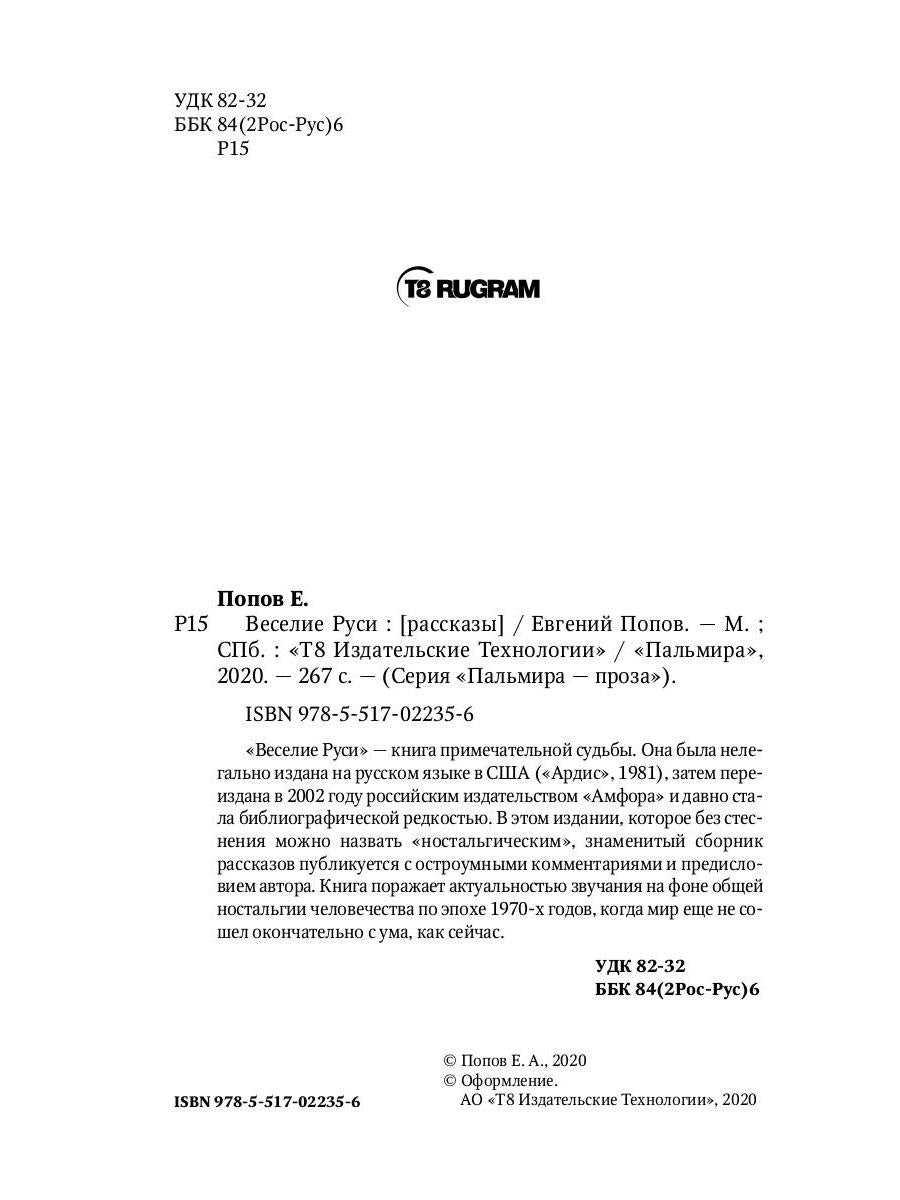 Handling time: 19 days Автор: Попов Е., «Веселие Руси: рассказы»: «Веселие Руси» — книга примечательной судьбы. Она была нелегально издана на русском языке в США («Ардис», 1981), затем переиздана в 2002 году российским издательством «Амфора» и давно стала библиографической редкостью. В этом издании, которое без стеснения можно назвать «ностальгическим», знаменитый сборник рассказов публикуется с остроумными комментариями и предисловием автора. Книга поражает актуальностью звучания на фоне общей ностальгии человечества по эпохе 1970-х годов, когда мир еще не сошел окончательно с ума, как сейчас.
