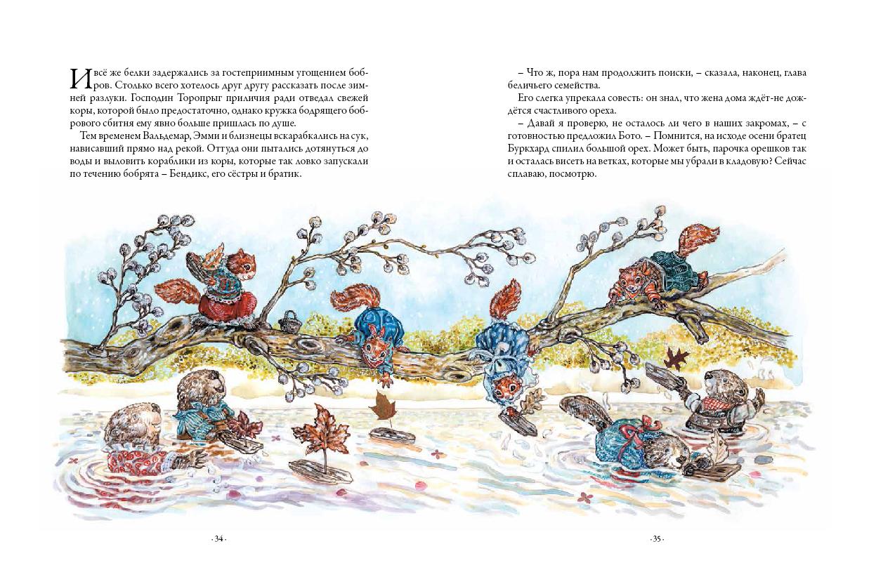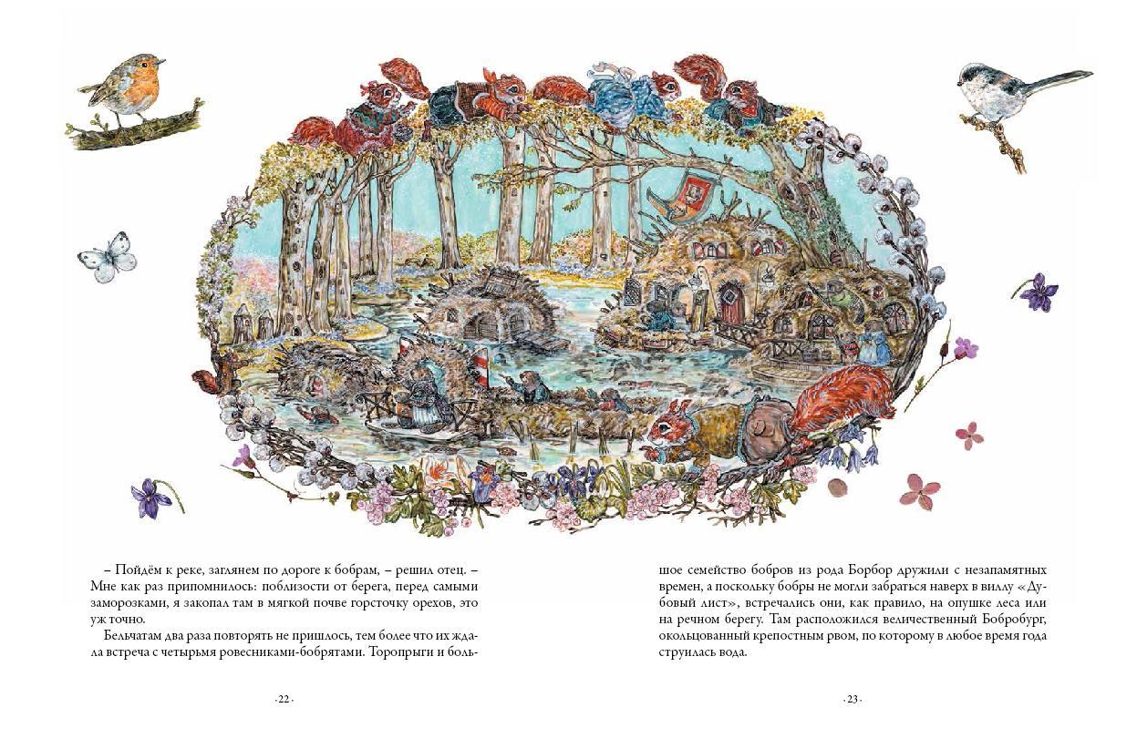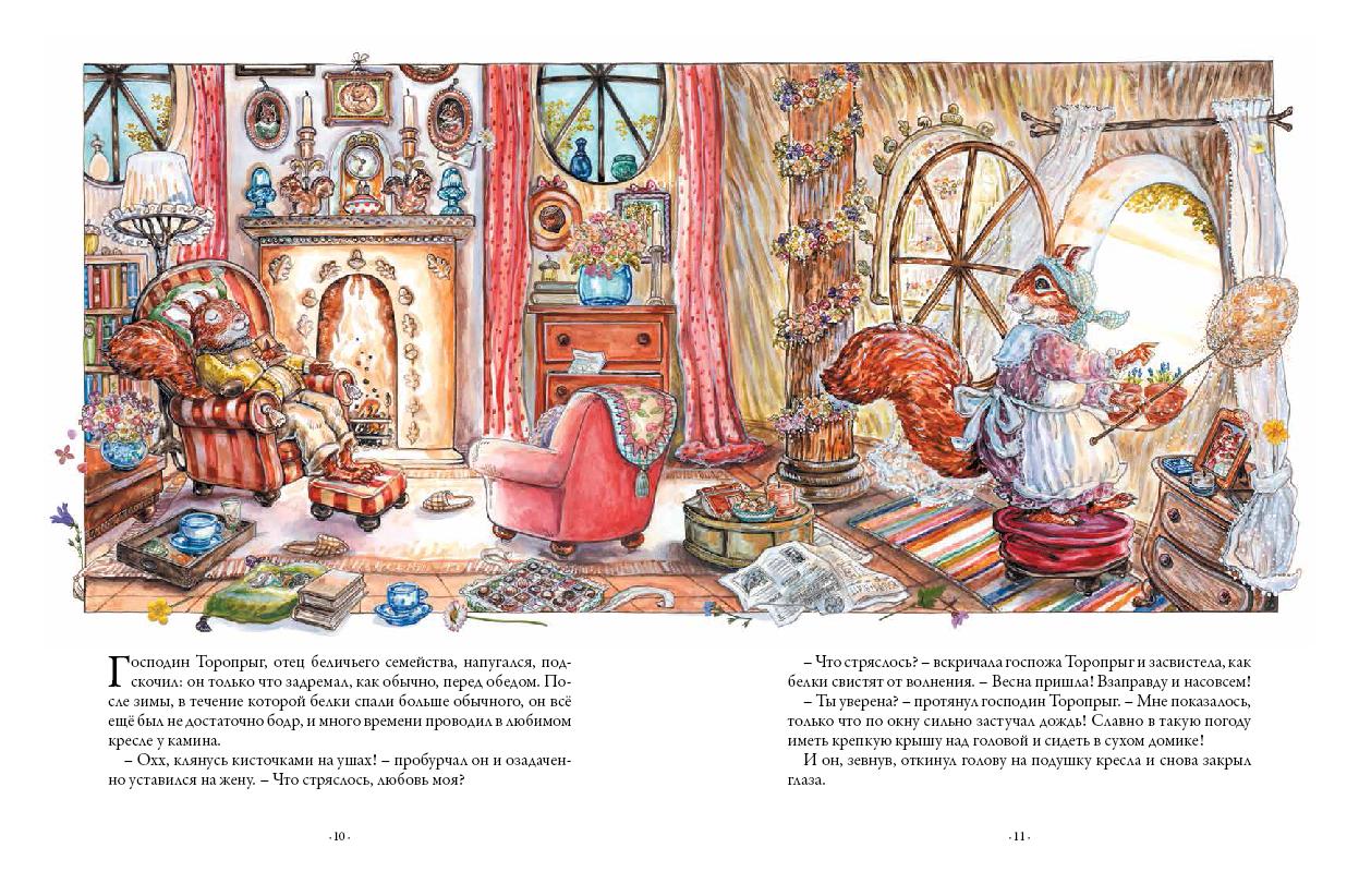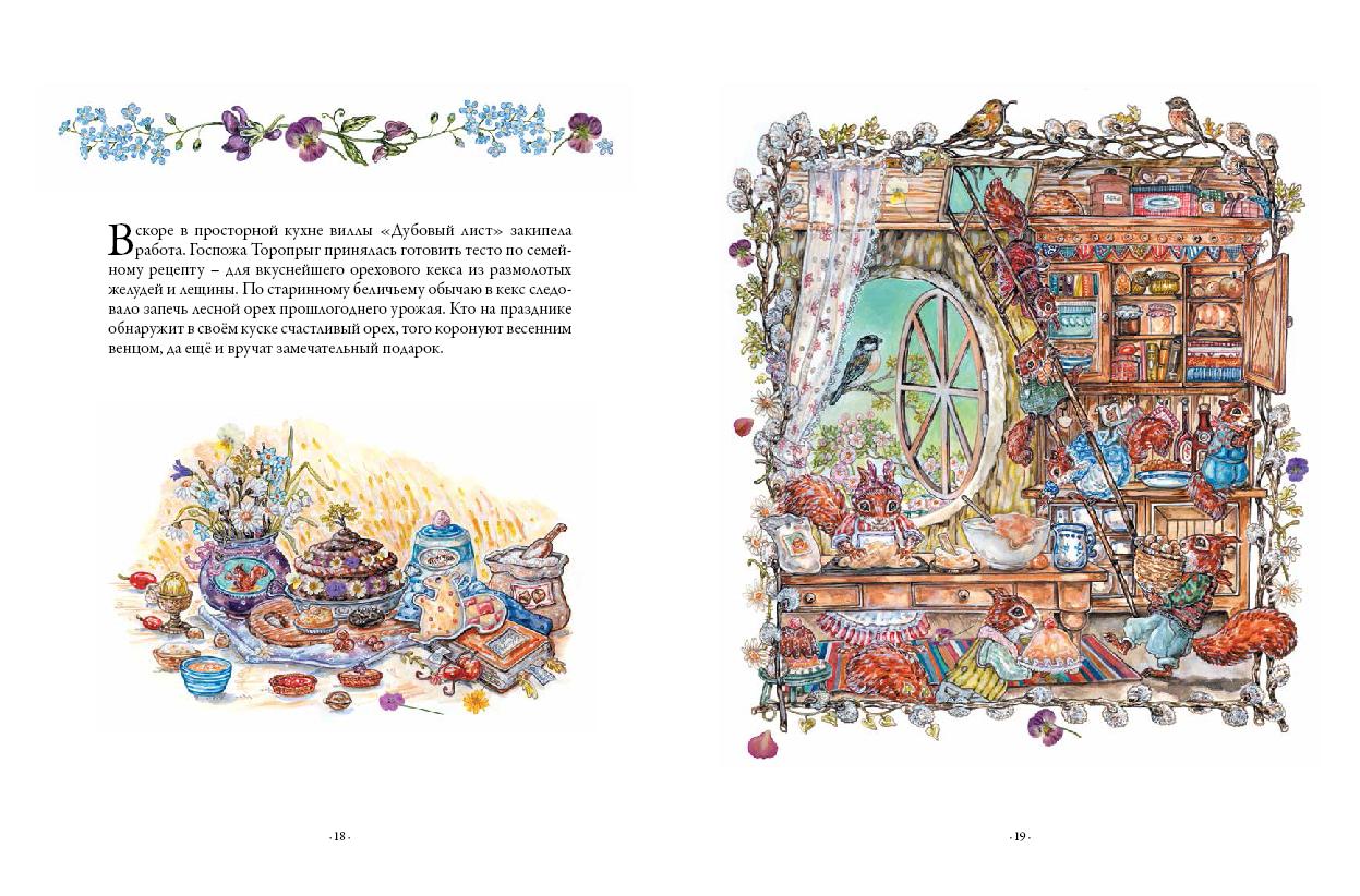 Весна идёт, весне дорогу!А вы уже слышали последние новости из жизни Торопрыг? Скоро выходит следующая книжка!На ветвях могучего дуба раскинулась вилла "Дубовый лист", с множеством комнат и кладовых, в которой проживает семейство белочек Торопрыг - мама, папа и четверо бельчат. А по соседству, соорудив гигантскую плотину, семья бобров Бороборов построила великолепный город Бобробург. Белки и бобры крепко дружат, как дружили их деды и прадеды: ходят друг к другу в гости, вместе справляют праздники, детишки сообща пускают кораблики: бобрята учат бельчат мастерить их из дубовой коры. Бельчата же обожают игру в "догонялки" - по правилам этой головокружительной охоты друг за другом положено бегать только по стенам и стволам, поэтому бобрята участвуют в ней только в качестве судей.Художница Каролина Роннефельдт наверняка не раз бывала в гостях и в их домиках, настолько подробно изображён в книжке каждый уголок в беличьих комнатках: можно рассмотреть все баночки-тарелочки, бельчачьи игрушки, вазочки, картины на стенах. А устройство хатки бобров? Вместе с главой семейства Борборов мы поднырнём под сучковатую корягу к подводному входу в жилище, по удобной лесенке поднимемся в уютное помещение и оглядимся: квартира бобров со всеми удобствами прорисована также в мельчайших подробностях.Сегодня белки и бобры приглашают нас на Праздник Весны: студёная зима позади, пора печь традиционный кекс со счастливым орехом внутри и веселиться.Книжка учит не только дружбе и взаимовыручке, но и ненавязчиво приобщает наших малышей к соблюдению семейных традиций. Детальные иллюстрации идеальны для длительного рассматривания, выдумывания собственных сюжетов и игры в "найди-покажи".