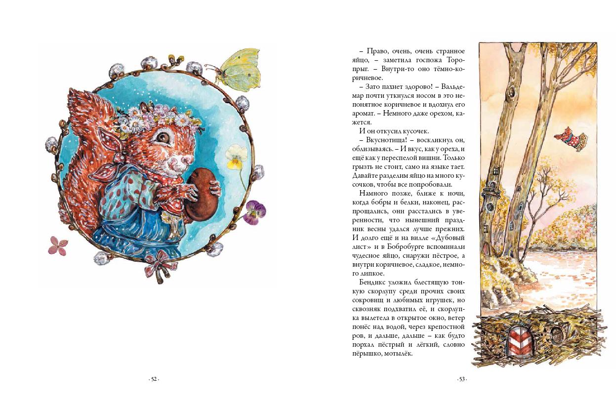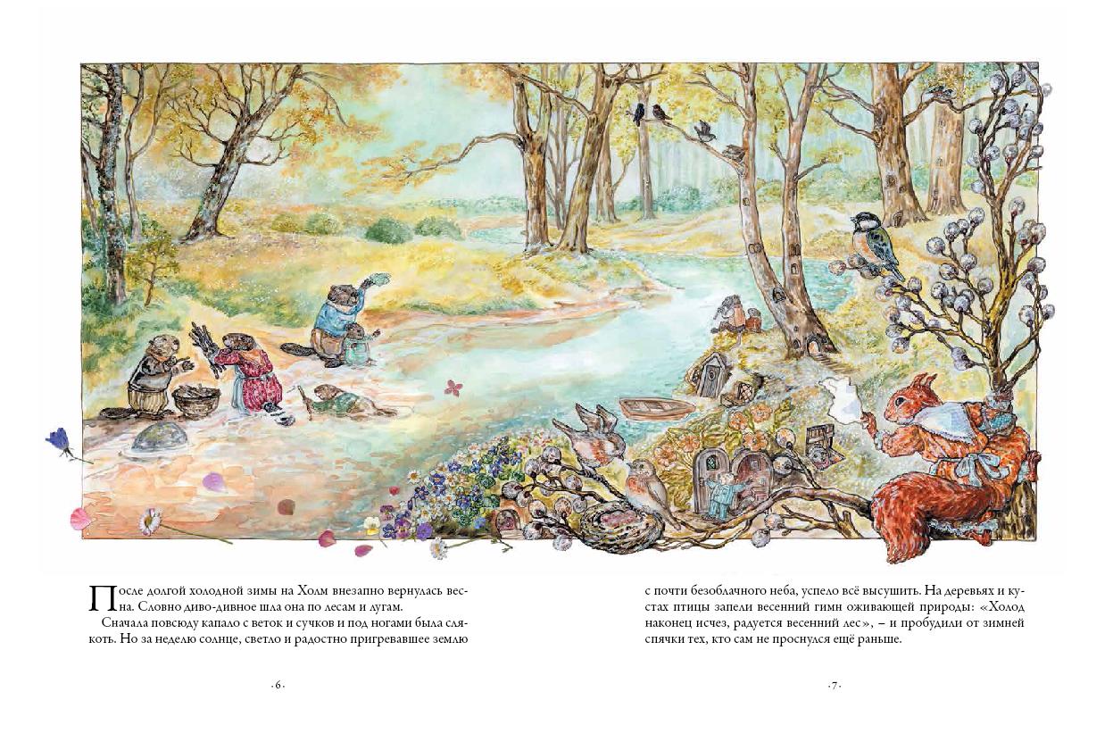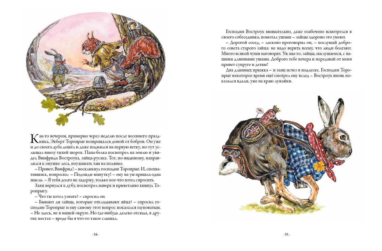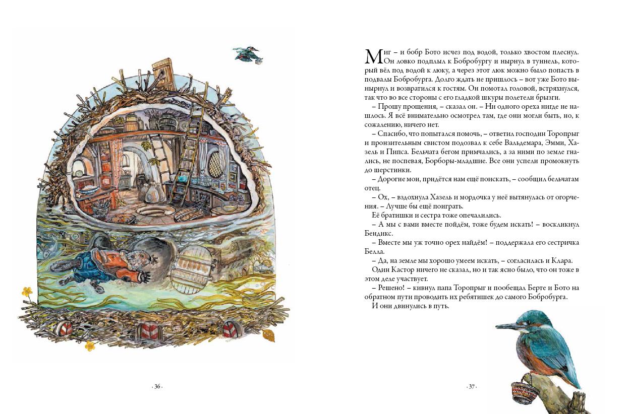 Весна идёт, весне дорогу!А вы уже слышали последние новости из жизни Торопрыг? Скоро выходит следующая книжка!На ветвях могучего дуба раскинулась вилла "Дубовый лист", с множеством комнат и кладовых, в которой проживает семейство белочек Торопрыг - мама, папа и четверо бельчат. А по соседству, соорудив гигантскую плотину, семья бобров Бороборов построила великолепный город Бобробург. Белки и бобры крепко дружат, как дружили их деды и прадеды: ходят друг к другу в гости, вместе справляют праздники, детишки сообща пускают кораблики: бобрята учат бельчат мастерить их из дубовой коры. Бельчата же обожают игру в "догонялки" - по правилам этой головокружительной охоты друг за другом положено бегать только по стенам и стволам, поэтому бобрята участвуют в ней только в качестве судей.Художница Каролина Роннефельдт наверняка не раз бывала в гостях и в их домиках, настолько подробно изображён в книжке каждый уголок в беличьих комнатках: можно рассмотреть все баночки-тарелочки, бельчачьи игрушки, вазочки, картины на стенах. А устройство хатки бобров? Вместе с главой семейства Борборов мы поднырнём под сучковатую корягу к подводному входу в жилище, по удобной лесенке поднимемся в уютное помещение и оглядимся: квартира бобров со всеми удобствами прорисована также в мельчайших подробностях.Сегодня белки и бобры приглашают нас на Праздник Весны: студёная зима позади, пора печь традиционный кекс со счастливым орехом внутри и веселиться.Книжка учит не только дружбе и взаимовыручке, но и ненавязчиво приобщает наших малышей к соблюдению семейных традиций. Детальные иллюстрации идеальны для длительного рассматривания, выдумывания собственных сюжетов и игры в "найди-покажи".