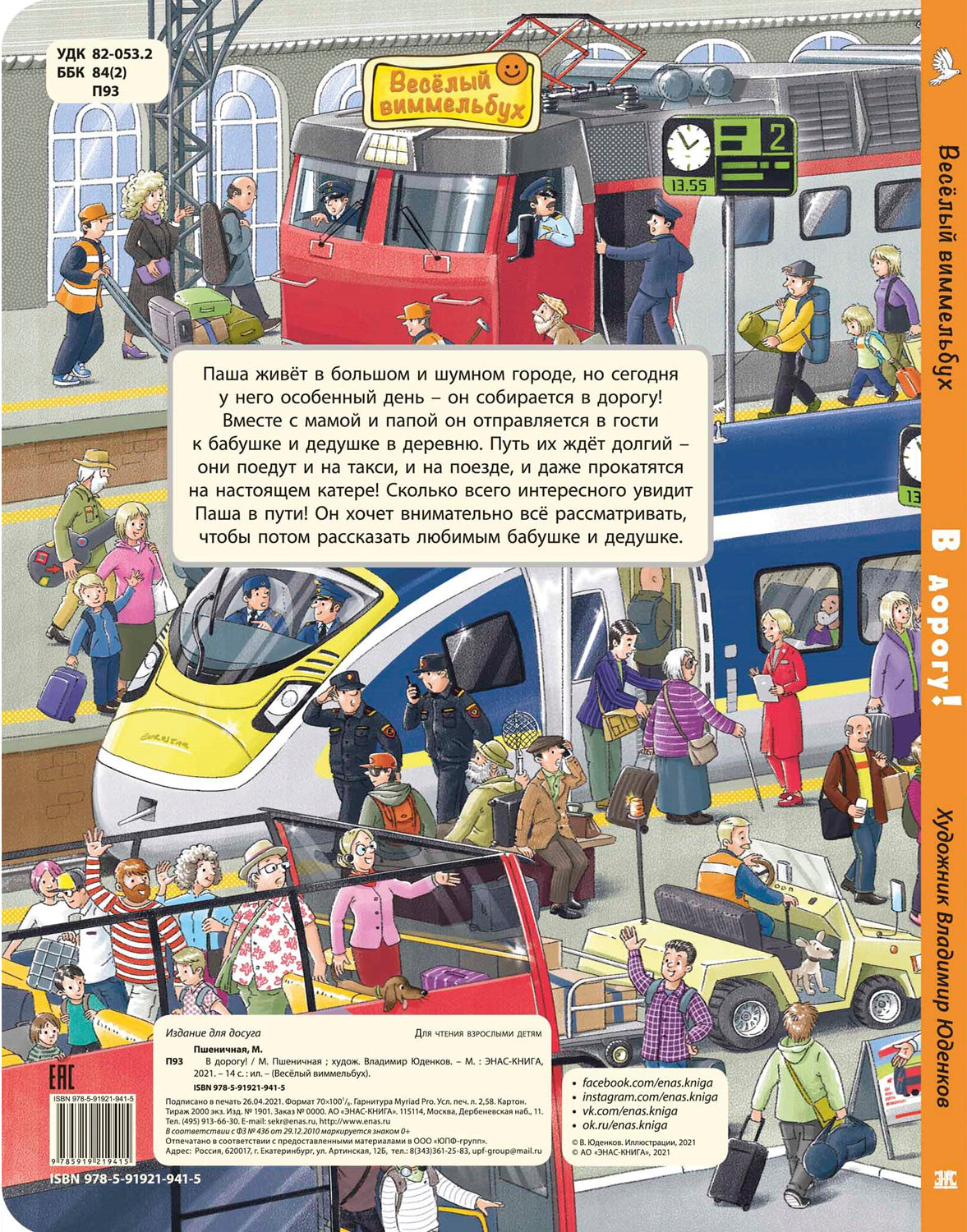 Handling time: 14 days В дорогу! Пшеничная М. Весёлый виммельбух Паша живёт в большом и шумном городе. Сегодня у него особенный день – он отправляется в дорогу! Вместе с мамой и папой он едет в гости к бабушке и дедушке в деревню. Путь их ждёт долгий – они поедут на такси, потом на поезде и даже на катере. Сколько всего интересного увидит Паша по дороге! Он будет внимательно всё рассматривать, чтобы потом рассказать любимым бабушке и дедушке. Рассматривай вместе с ним! Книга большого формата, напечатана на плотном картоне. Для чтения взрослыми детям. Художник Владимир...