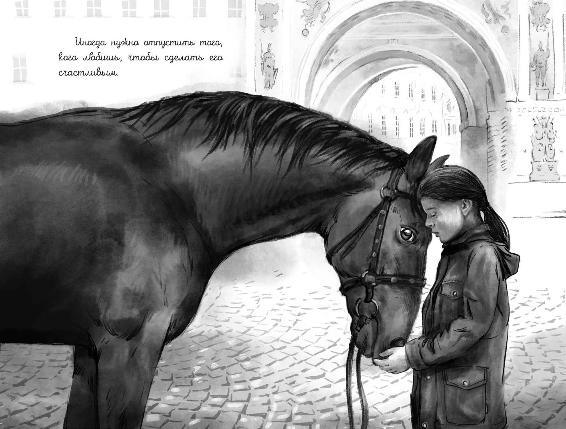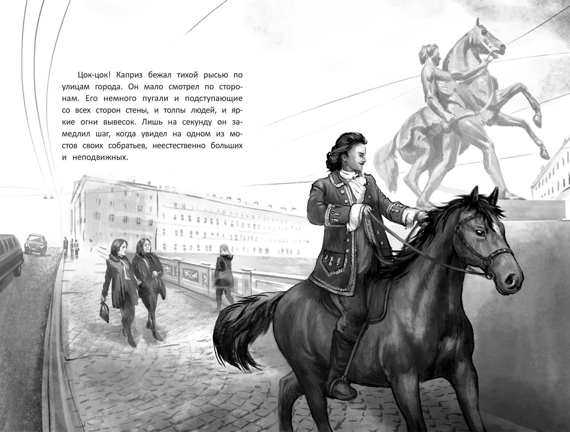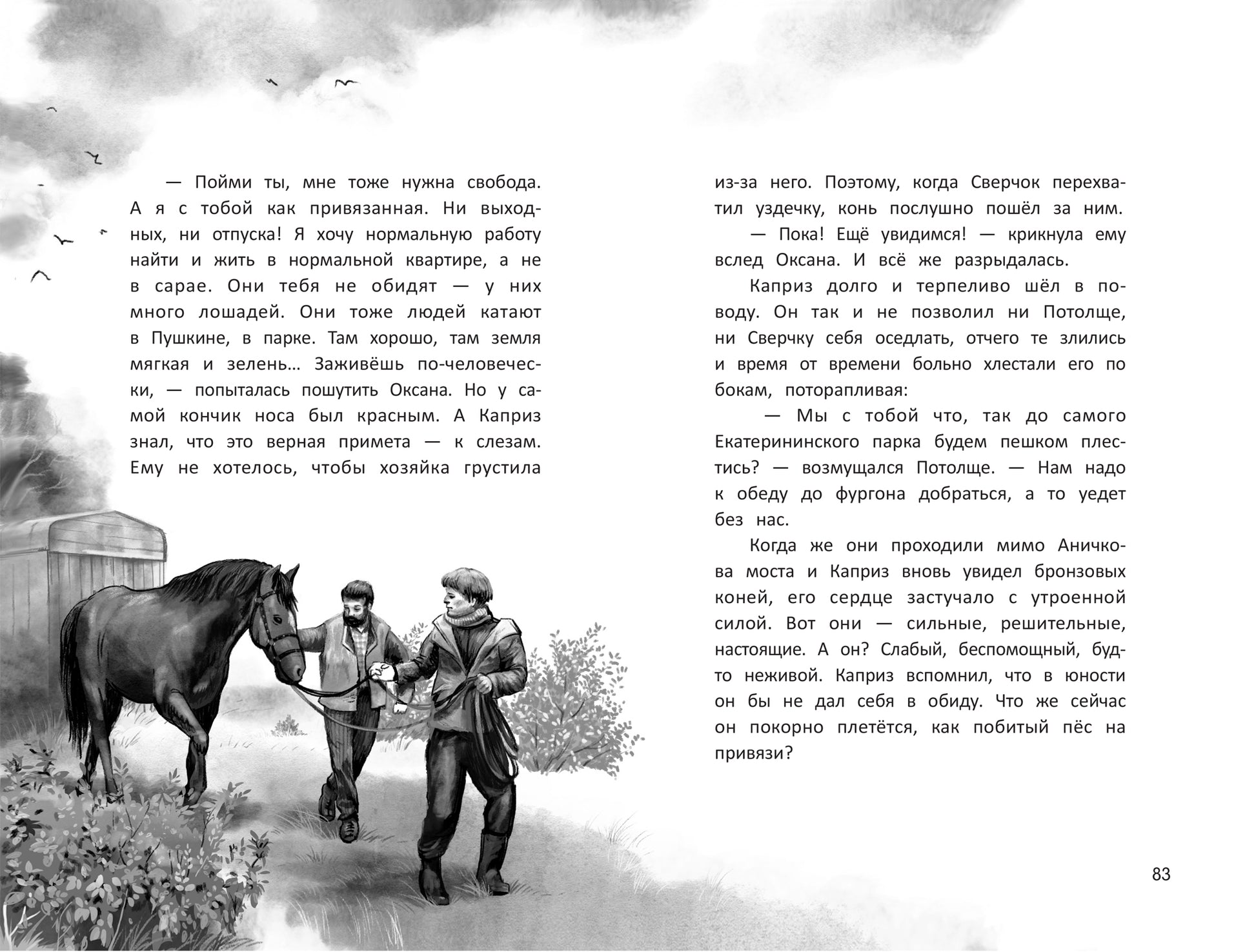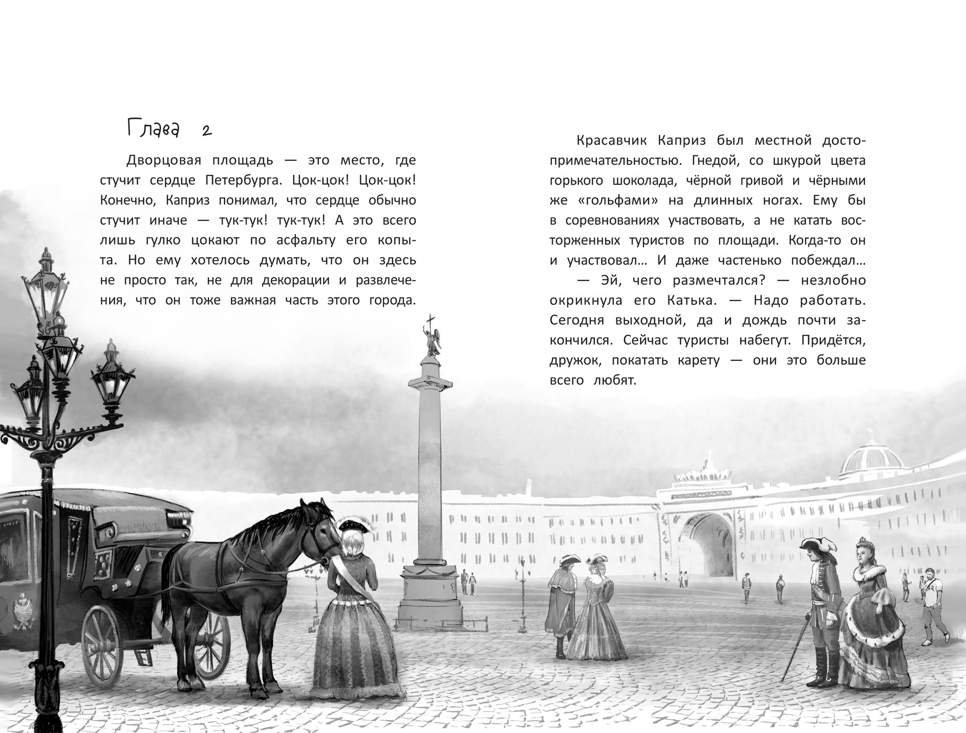 Эта история вместила в себя многое. И атмосферу величественного Петербурга с его гранитными набережными, роскошными дворцами и непревзойдёнными скульптурами. И переживания мальчика, который учится в художественной школе и мечтает помочь своему необычному другу. И стремление к вольной жизни прекрасного коня Каприза, катающего туристов по Дворцовой площади. Эти три мотива переплетаются воедино, чтобы дополнить друг друга и дать повод для размышлений. Правда ли, что даже один маленький человек в силах совершить большое добро? Всегда ли рядом оказываются те, кто может помочь? И нужно ли иногда отпустить того, кого любишь, чтобы сделать его счастливым?