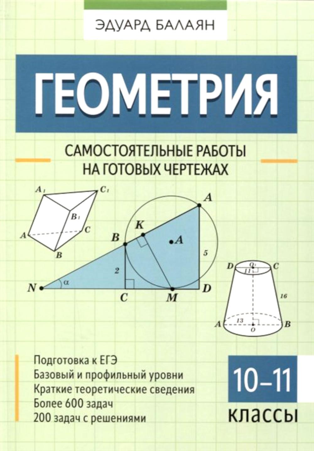 Handling time: 14 days Предлагаемые самостоятельные работы по геометрии на готовых чертежах предназначены для занятий в 10-11 классах. Они ориентированы на учебник "Геометрия. 10-11 классы" Л. С. Атанасяна и др. Вместе с тем их можно использовать при работе и по другим учебникам для 10-11 классов, входящим в Федеральный перечень учебной литературы.