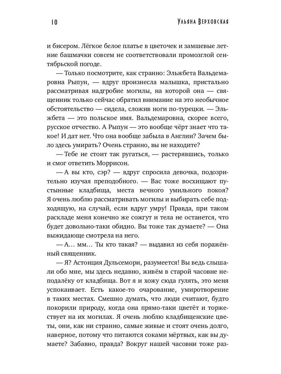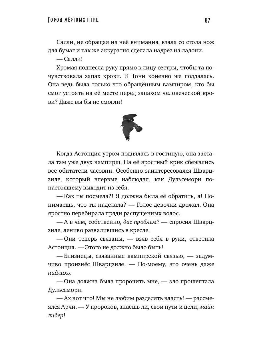 Handling time: 19 days Автор: Верховская Ульяна, «Город мёртвых птиц»: Викторианский городок Локшер мирно загнивал в своём пристойном благочестии, но тут появилась она – Астонция Дульсемори, маленькая вампирша, несущая смерть и революцию, желающая творить справедливость любой ценой. Она вознамерилась стать городской легендой и уверенно идёт к своей цели, попутно заводя друзей и врагов, играя в куклы, судьбы и террор. Пока весьма заурядный спутник Астонции развлекается, охмуряя местных кумушек и показывая карточные фокусы, девочка решает проблемы города с присущим ей юмором, весьма чёрным и пугающим! Но мысль о таинственном преследователе, ищущем её уже несколько веков, не даёт вампирше покоя. А ещё птицы, повсюду эти проклятые птицы!