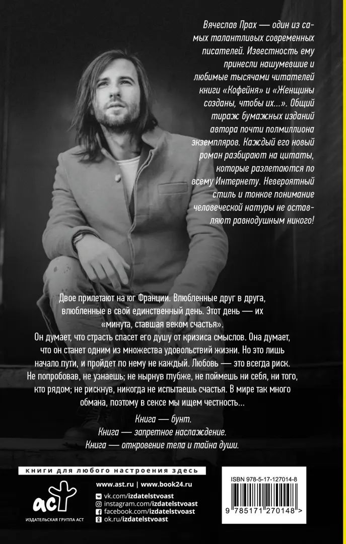 Новый роман-откровение от Вячеслава Праха — автора нашумевших бестселлеров «Кофейня», «Женщины созданы, чтобы их…», «Слова, которые нам не говорили родители…»! Двое прилетают на юг Франции. Влюбленные друг в друга, влюбленные в свой единственный день. Этот день — их «минута, ставшая веком счастья».Он думает, что страсть спасет его душу от кризиса смыслов. Она думает, что он станет одним из множества удовольствий жизни. Но это лишь начало пути, и пройдет по нему не каждый. Любовь — это всегда риск. Не попробовав, не узнаешь; не нырнув глубже, не поймешь ни себя, ни того, кто рядом; не рискнув, никогда не испытаешь счастья. В мире так много обмана, поэтому в сексе мы ищем честность…Книга — бунт.Книга — запретное наслаждение.Книга — откровение тела и тайна души. Пять причин купить 1Новый роман-откровение от автора нашумевших бестселлеров «Кофейня», «Женщины созданы, чтобы их…» и «Слова, которые нам не говорили родители…»! 2Совокупный тираж книг Вячеслава Праха более 300 000 экземпляров! Один из самых популярных российских писателей в интернете, его книги цитируют на своих интернет-страницах тысячи людей и многие тематические сообщества. 3Чувственный и искренний роман «18+», гораздо более глубокий, чем может показаться на первый взгляд. Познание себя и другого человека, жизненные кризисы и их преодоление. 4Две женщины главного героя: Дева и Муза — такие разные и такие порочно-безупречные. Благодаря им он изучает себя, женщин и целый мир вокруг: разумом, душой и телом. 5Цитата: «Любовь — это всегда риск. Пусть человек не боится сделать тебе больно: не попробовав — не узнает, не рискнет — никогда не испытает настоящего счастья. Трусость — один из самых страшных человеческих пороков, и самый страшный для тех, кто хочет прожить много жизней, пройти много дорог, испытать много чувств».