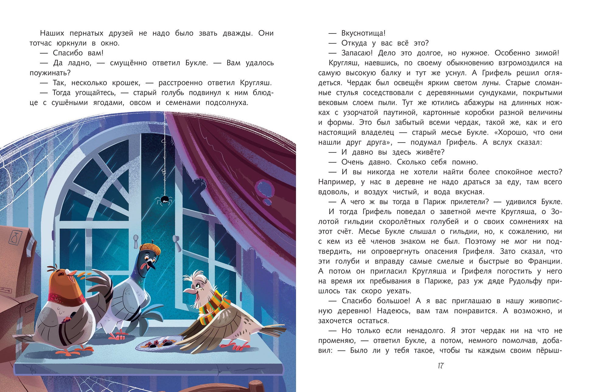 А что, если взять и отправиться вслед за своей мечтой? Ведь для такого путешествия необязательно быть самым храбрым в мире, достаточно просто верить в счастливую звезду! Кстати, не только люди умеют мечтать, голуби тоже. Именно поэтому обычный сизый голубь по имени Кругляш направляется в Париж. Его мечта - попасть в Золотую гильдию скоролётных голубей. Вместе с ним летит и его друг Грифель, чтобы поддержать товарища в столь важном решении. Героев ждут новые знакомства и невероятные приключения. Им откроются тайны прошлого и представится возможность выбрать своё будущее! Пять причин купить 1Эта история научит детей верить в свои силы. 2Яркие иллюстрации в стиле современных мультфильмов. 3Увлекательная история будет интересна как для детей, так для взрослых. 4Стильное оформление: твердый переплет и высокое качество печати. 5Отличный подарок к любому событию.
