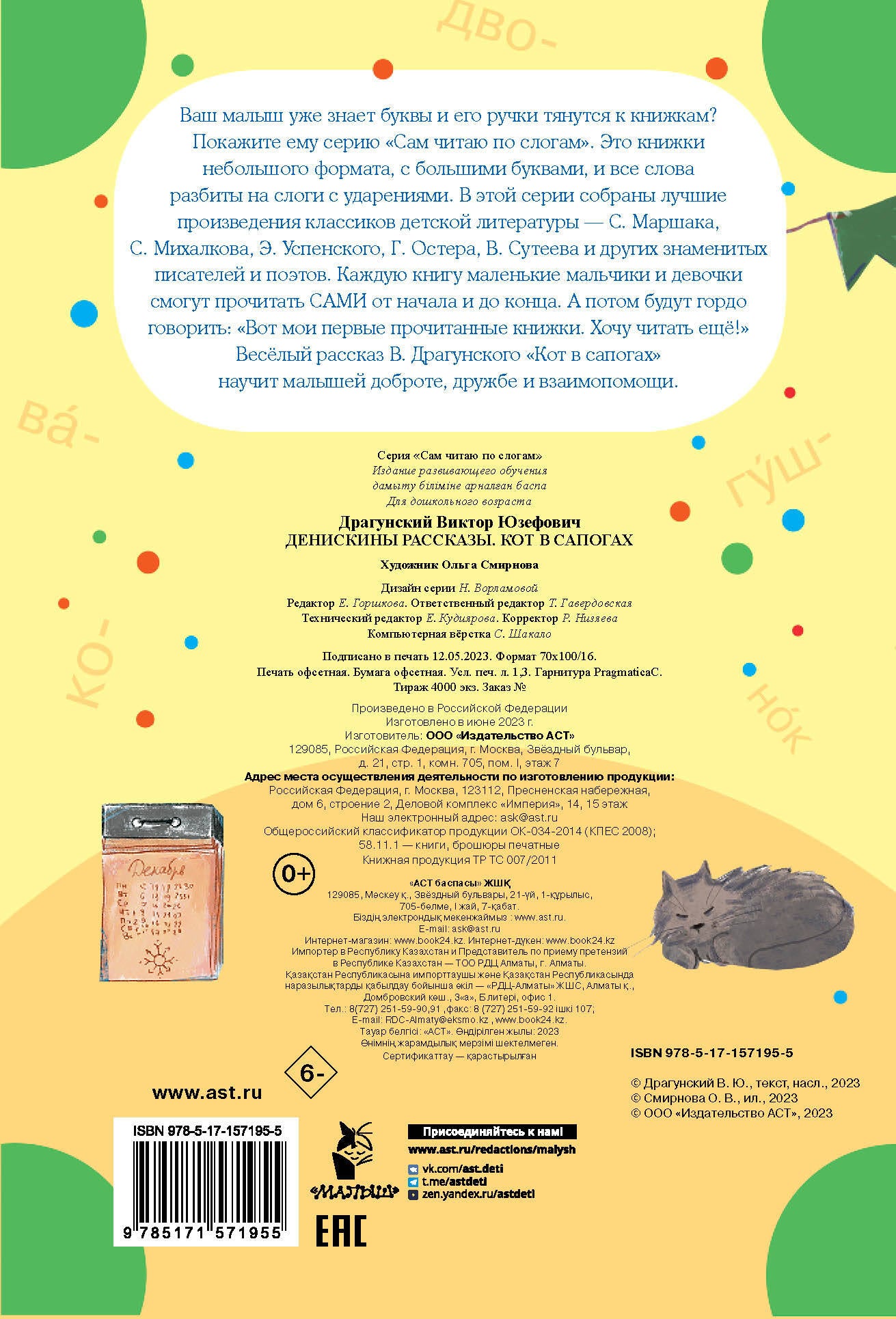Ваш малыш уже знает буквы и его ручки тянутся к книжкам? Покажите ему серию "Сам читаю по слогам". Это книжки небольшого формата, с большими буквами, и все слова разбиты на слоги с ударениями. В этой серии собраны лучшие произведения классиков детской литературы - С. Маршака, С. Михалкова, Э. Успенского, Г. Остера, В. Сутеева и других знаменитых писателей и поэтов. Каждую книгу маленькие мальчики и девочки смогут прочитать сами от начала и до конца. А потом будут гордо говорить: "Вот мои первые прочитанные книжки. Хочу читать ещё!".Весёлый рассказ В. Драгунского "Кот в сапогах" научит малышей доброте, дружбе и взаимопомощи.Для дошкольного возраста.Крупный шрифт, разбивка на слоги, ударения, запоминающиеся цветные иллюстрации - в книгах серии "Сам читаю по слогам" есть всё необходимое для формирования у ребенка прочного навыка чтения и стимулирования устойчивого интереса к книге.А еще это прекрасная возможность познакомиться с лучшими произведениями любимых детских авторов, многие из которых стали неотъемлемой частью отечественной культуры. Знать их - признак образованного, культурного человека.Идеальное сочетание "цена-качество! Книги не будут обременительны для семейного бюджета и принесут массу пользы, создадут прекрасное настроение.Герои из рассказа «Кот в сапогах» — веселые и находчивые мальчишки, чьи радости и переживания будут близки и понятны малышам. Они не только от души посмеются над историей, но и найдут для себя пример для подражания.