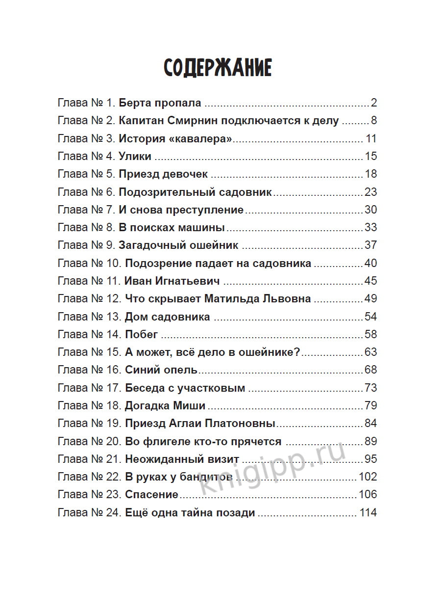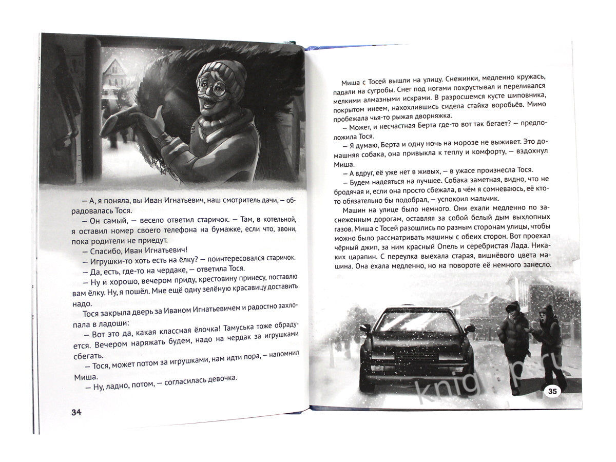 «Берта пропала!» — с этих слов началось одно зимнее утро братьев Севы и Миши. Думали ли мальчишки, что каникулы в деревне превратятся в новое детективное приключение?! Осталось только дождаться подруг — Тосю и Тамусю — таких же неугомонных любительниц расследований и тайн, и приниматься за дело! Похищение собаки элитной породы — казалось бы, ничего запутанного в этом событии нет. Ведь пёсика можно выгодно продать. Но нет! Секреты кроются в мелочах! Скорее открывайте книгу и вместе с её главными героями по крупицам соберите ключи к разгадке необычного похищения. Детектив будет интересен читателям 8—12 лет. А если не хочется расставаться с дружной четвёркой друзей, читайте ещё одну увлекательную историю с их участием — «Тайна заброшенного дома».