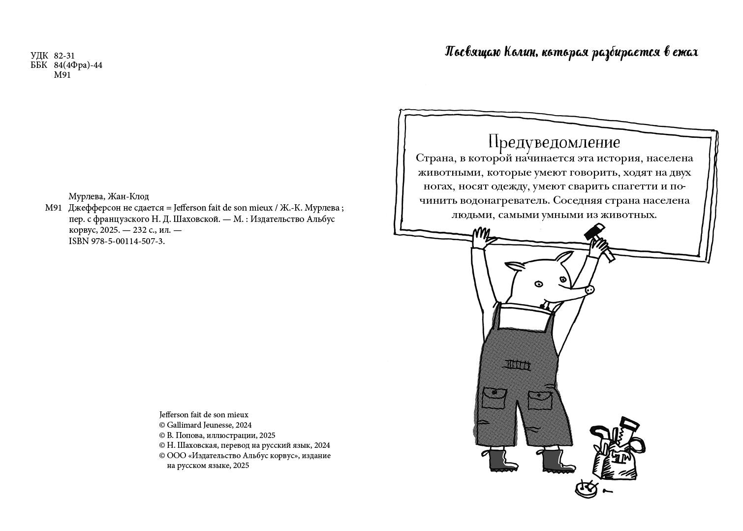 Handling time: 34 days Еж Джефферсон — детектив-любитель. Он обладает цепким умом и острым желанием всегда добиться справедливости.В новой книге Джефферсон и его друг свин Жильбер получают странную записку от знакомой крольчихи Симоны, которая просит проследить за домом, пока ее не будет. Заподозрив неладное, Джефферсон и Жильбер обращаются за помощью к пожилому барсуку Хильду и кабану Вальтеру Скотту и все вместе на стареньком авто отправляются выяснять, что же случилось. Чутье их не обмануло: Симона в опасности!Об авторах:Жан-Клод Мурлева — французский детский писатель. В 2021 году получил премию памяти Астрид Линдгрен, которую вручают за достижения в области литературы для детей и подростков. Виктория Попова — художник-иллюстратор. Финалист конкурса «The Unpublished Picturebook Showcase», лауреат премии IJungle Illustration Awards, конкурса «Образ книги».