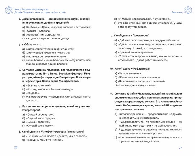 Дизайн Человека — это мощный, практичный инструмент, помогающий проживать свою жизнь каждому, кто им пользуется. Проживать свою жизнь — означает быть счастливым и реализованным во всех ее областях.Кто ты есть на самом деле? В чем твое предназначение? В каком направлении лежит твой путь и как тебе по нему идти? Дизайн Человека расскажет об этом во всех подробностях.Эту систему не случайно называют экспериментом, Дизайн Человека делает упор не на теоретическую составляющую, а на практическую. Да, разбираться в своем Дизайне очень весело, познавательно и позволяет глубоко узнать себя, но это так и останется на уровне ума, если вы не будете практиковать то, что узнали.Благодаря эксперименту, ваша жизнь изменится, как будто вы всегда носили дымчатые очки, а тут вдруг сняли, и мир оказался совсем не таким, каким вы себе его представляли, а намного лучше.Каждый из нас, без исключения, пришел в этот мир для того, чтобы прожить свою личную историю от души. Раз вы читаете эти строки, значит, пришло время.Амара Марина Маршенкулова