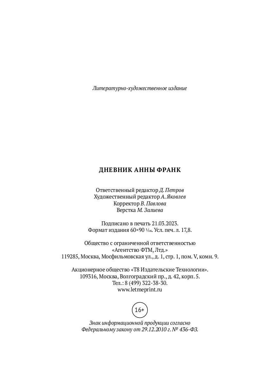 Handling time: 19 days Автор: Франк Анна, «Дневник Анны Франк»: Анна Франк (1929–1945) - еврейская девочка, родившаяся в Германии, после прихода Гитлера к власти скрывавшаяся с семьей от нацистского террора в Нидерландах. В своем дневнике она рассказывает вымышленной подруге обо всем, что происходит с ней и с другими обитателями убежища. Дневник Анны Франк был впервые опубликован в 1947 году, многократно переиздавался, был переведен на десятки языков и стал лучшим памятником жертвам Холокоста.