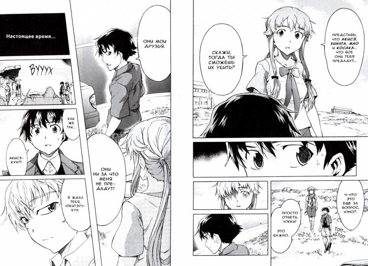 Handling time: 19 days У ничем не примечательного ученика средней школы Юкитэру Амано есть одно хобби - он ведет в своем телефоне дневник, куда записывает все, что происходит вокруг. Однажды утром он обнаруживает в нем записи из будущего. Поначалу Юкитэру не нарадуется открывшимся перед ним перспективам, но в один прекрасный день он натыкается на описание собственной смерти. Как оказалось, Юкитэру, сам того не подозревая, стал одним из двенадцати владельцев дневников будущего - участников беспощадной игры на выживание, организованной всемогущим повелителем времени и пространства. Удастся ли ему пройти игру? И может ли он довериться странной однокласснице Юно, заявившей, что они с ним обречены быть вместе?