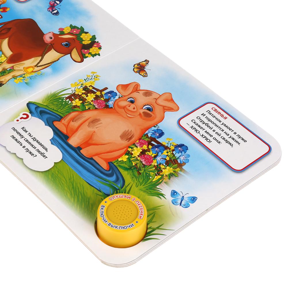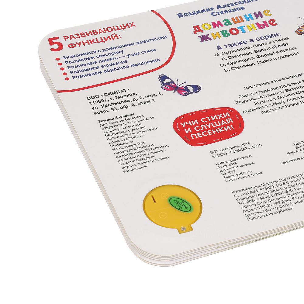 Яркая книга в игровой форме познакомит ребёнка с домашними животными. Малыш с радостью будет рассматривать яркие иллюстрации, выполнять задания и слушать песенки и добрые стихотворения Владимира Степанова. Книжка сделана из плотного картона, поэтому можно не опасаться, что ребёнок порвёт странички.