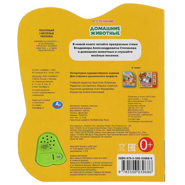 Handling time: 24 days Музыкальная книга «В. Степанов. Домашние животные» ТМ «УМка» станет отличным подарком для вашего малыша:- 1 музыкальная кнопка в виде нотки с огоньками- 3 песни на стихи В. Степанова: «Корова», «Овца», «Утята»- красочные иллюстрацииРебёнок с удовольс
