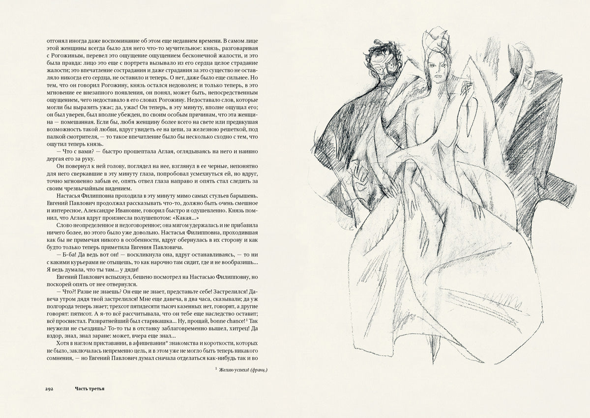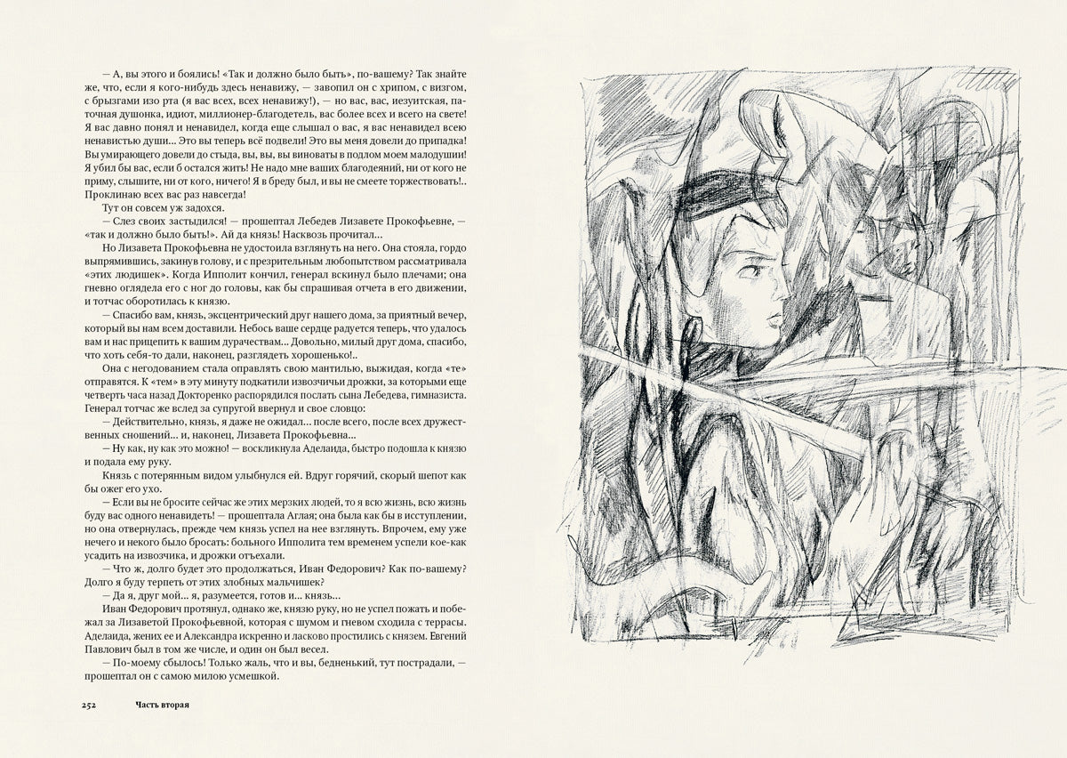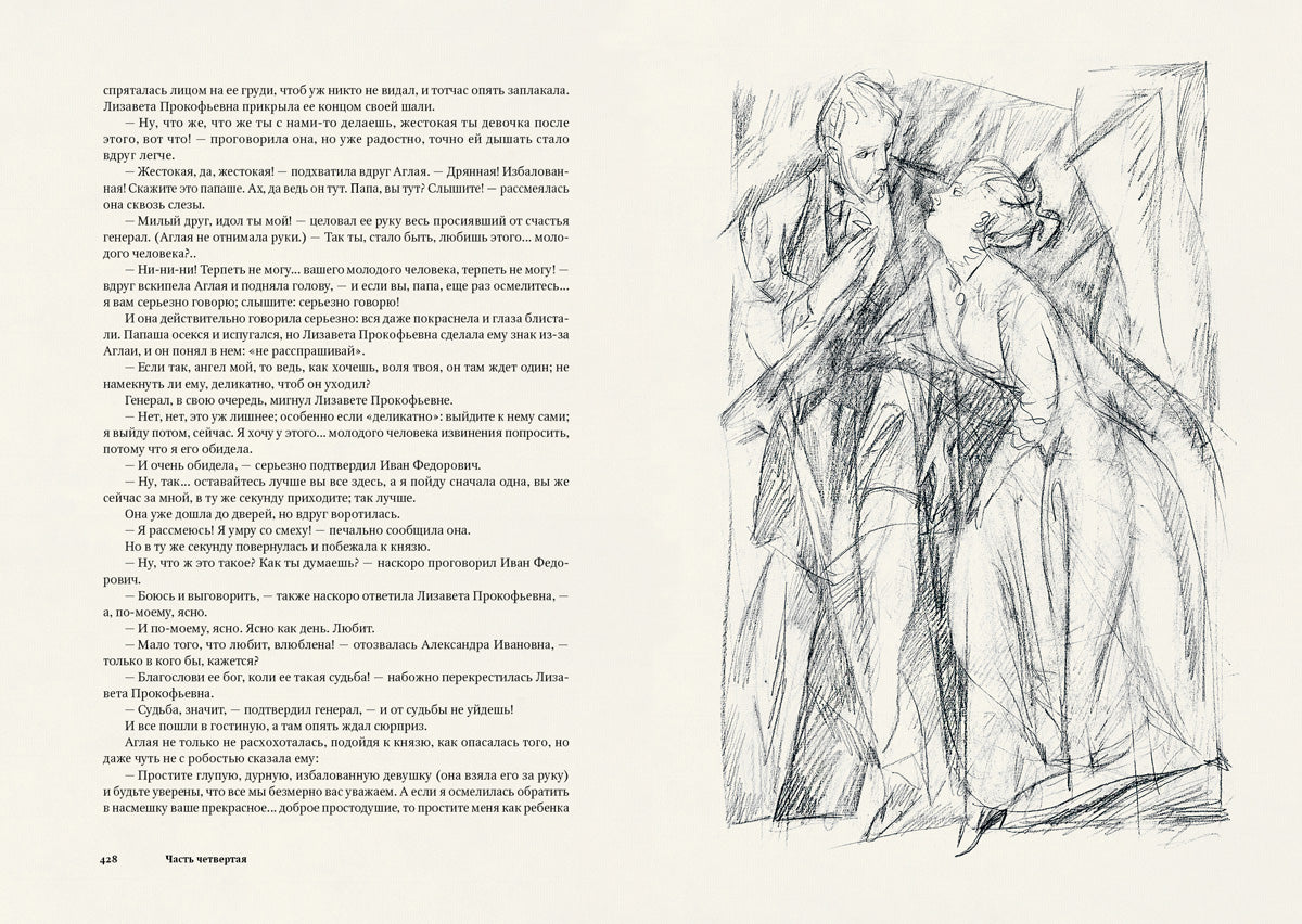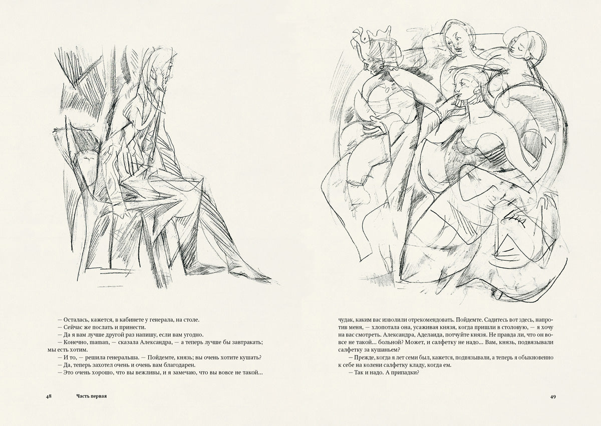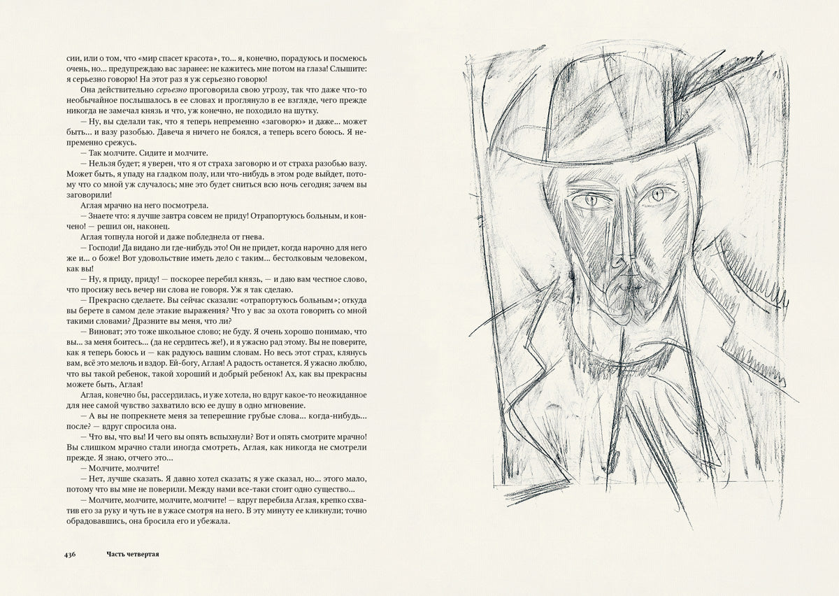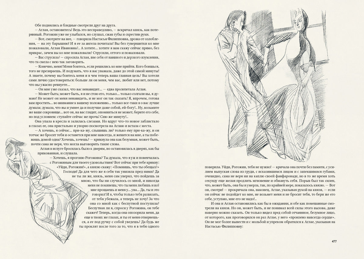 А ровно через сто лет к роману обратится художник Виталий Горяяев и как будто действительно осветит героев Достоевского слишком ярким электрическим огнем. Нервными, изломанными, спутанными линиями он создаст темные и светлые лики-маски, сформирует фигуры и убедит их взаимодействовать. Рисунки Горяева заставят почувствовать напряжение идей и страстей, саму суть романа Достоевского, так оригинально и свободно переданную карандашом на бумаге.