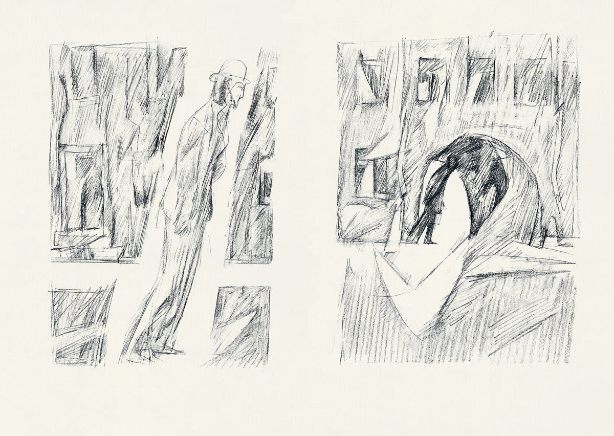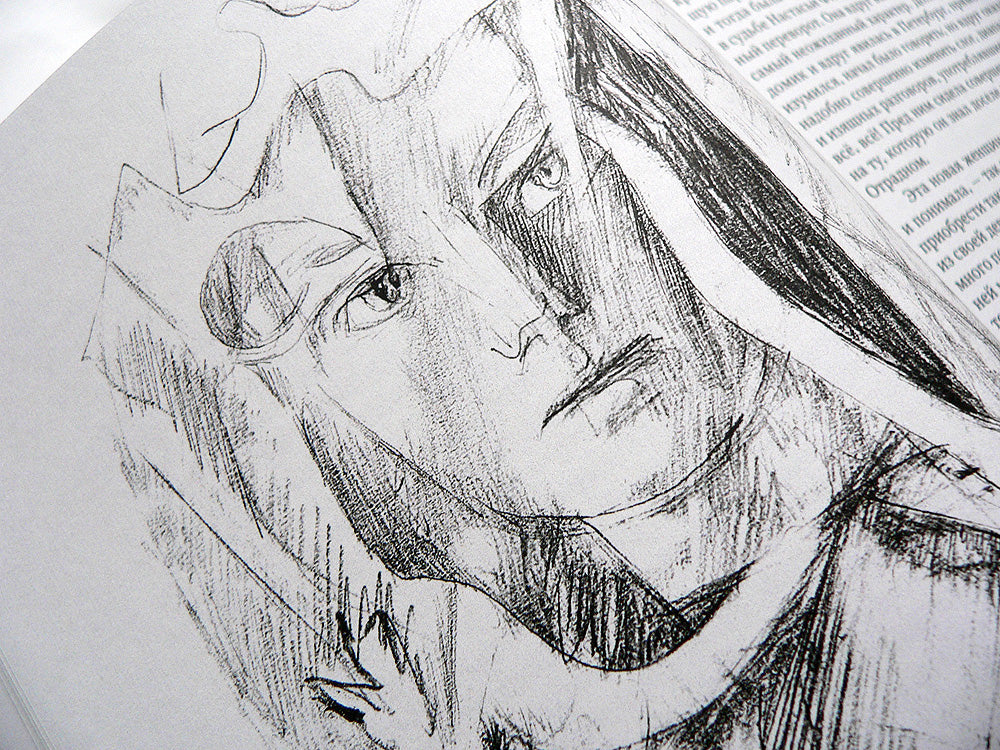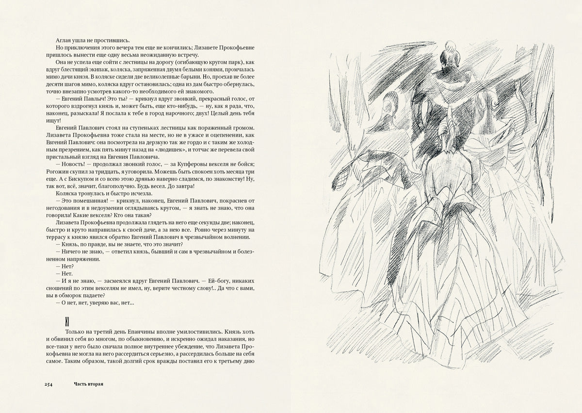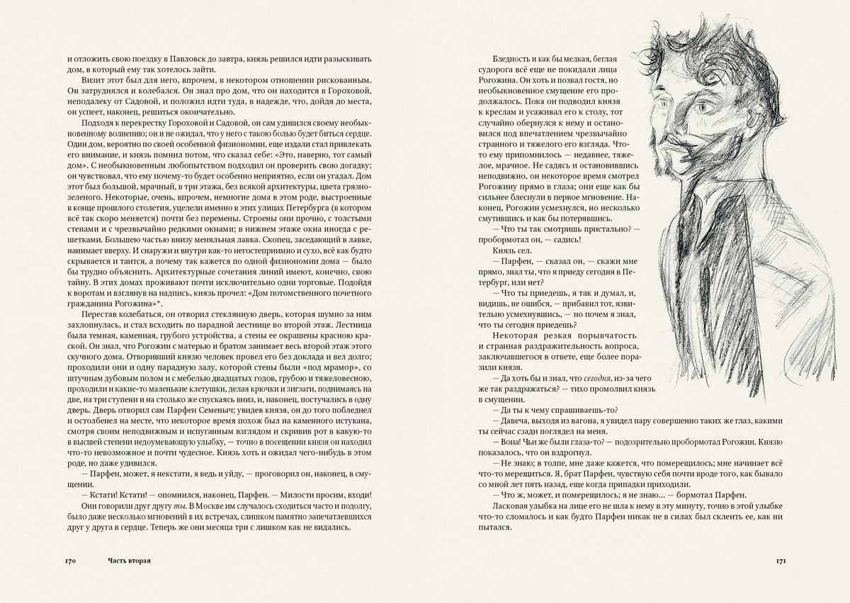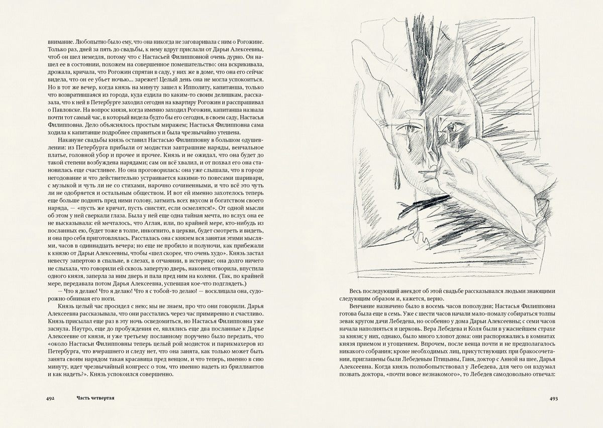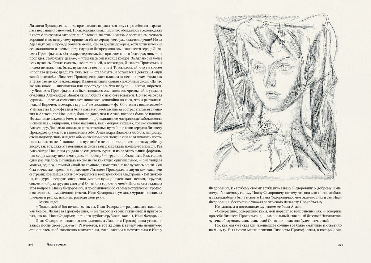 А ровно через сто лет к роману обратится художник Виталий Горяяев и как будто действительно осветит героев Достоевского слишком ярким электрическим огнем. Нервными, изломанными, спутанными линиями он создаст темные и светлые лики-маски, сформирует фигуры и убедит их взаимодействовать. Рисунки Горяева заставят почувствовать напряжение идей и страстей, саму суть романа Достоевского, так оригинально и свободно переданную карандашом на бумаге.