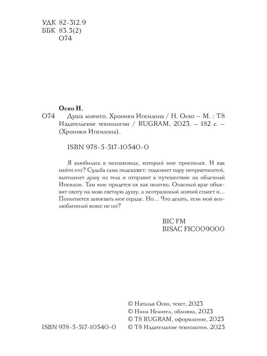 Handling time: 19 days Автор: Оско Наталья, «Душа ловчего. Хроники Ипсилона»: Я влюбилась в незнакомца, который мне приснился. И как найти его? Судьба сама подскажет: подкинет пару неприятностей, вытолкнет душу из тела и отправит в путешествие на облачный Ипсилон. Там мне придется ох как нелегко. Опасный враг объявит охоту на мою светлую душу, а неотразимый ловчий спасет и... Попытается завоевать мое сердце. Но... Что делать, если мой возлюбленный вовсе не он?