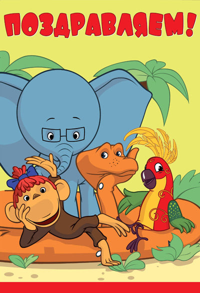 Д-12229 Открытка среднего формата. Поздравляем! Детская. Текст (из мультфильма 38 попугаев) (УФ-лак)