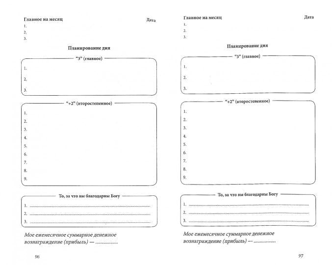 Handling time: 24 days Что вы делаете, когда вам нужно добраться до важного для вас, но не знакомого места (из пункта А в пункт В)? Вы открываете карту или включаете навигатор, мысленно или на листе бумаги прокладываете маршрут и движетесь по нему. Тогда вы точно попадете туда, куда вам надо (в пункт В), так как знаете, мимо чего проезжать и где сворачивать.А что происходит, если вы, не глядя на карту или не включая навигатора, садитесь за руль, выезжаете на шоссе и едете туда, куда направляется основной поток автомобилей? Шансы оказаться в желаемом пункте В равны нулю (0!).То же самое происходит с вами, если вы хотите чего-то достичь, реализовать некий замысел, но при этом не имеете понятия, что нужно делать каждый день, дабы приблизиться к цели. Вы можете читать умные книги, визуализировать, "открывать чакры'', общаться с успешными людьми, мыслить позитивно, молиться, но если вы не определили для себя то, что реально продвинет вас к цели, не видите этого и не представляете, то пункт В как был для вас недосягаемым, так им и останется.Вы мечтаете, что сейчас произойдет нечто, подымется занавес - и вы окажетесь в пункте В. Обычно такого не происходит. Нужны хотя бы малые, но конкретные усилия для получения конкретного результата. Вам нужно проделывать конкретные действия, чтобы переместиться из пункта А в пункт В. Нужно (I) думать головой, (2) в чем-то меняться и (3) двигаться.Дабы помочь в этом увлекательном и созидательном процессе движения по жизни, и был разработан данный ежедневник. Вам предлагается простая система планирования, которая поможет проложить маршрут из пункта А в пункт В. Причем вносить в ежедневник вы будете только ту информацию, которую посчитаете необходимой для достижения целей.Постепенно вы научитесь все четче видеть те дела, которые реально приносят результат и продвигают вас к цели, а также то, что отвлекает, на что вы тратите энергию и силы впустую.2-е издание, доработанное
