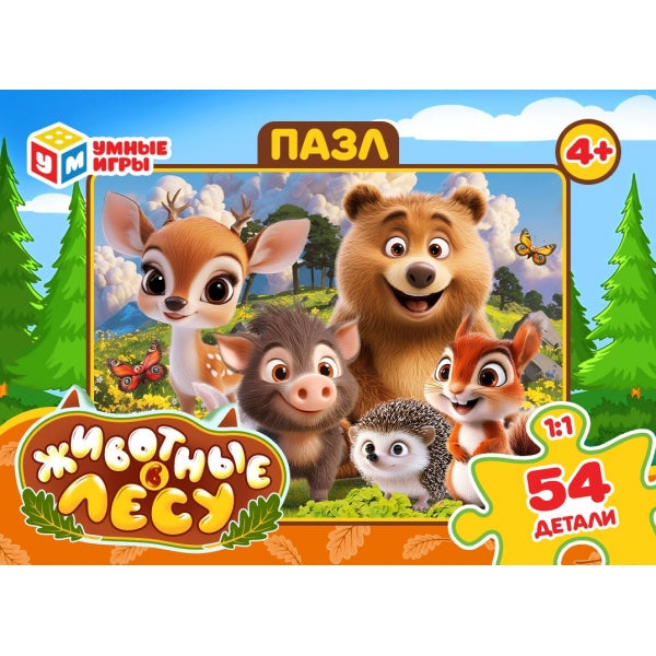 Животные в лесу. Пазлы в коробке 54 детали. 90х65х25 мм. Умные игры в уп.32шт в кор.8уп