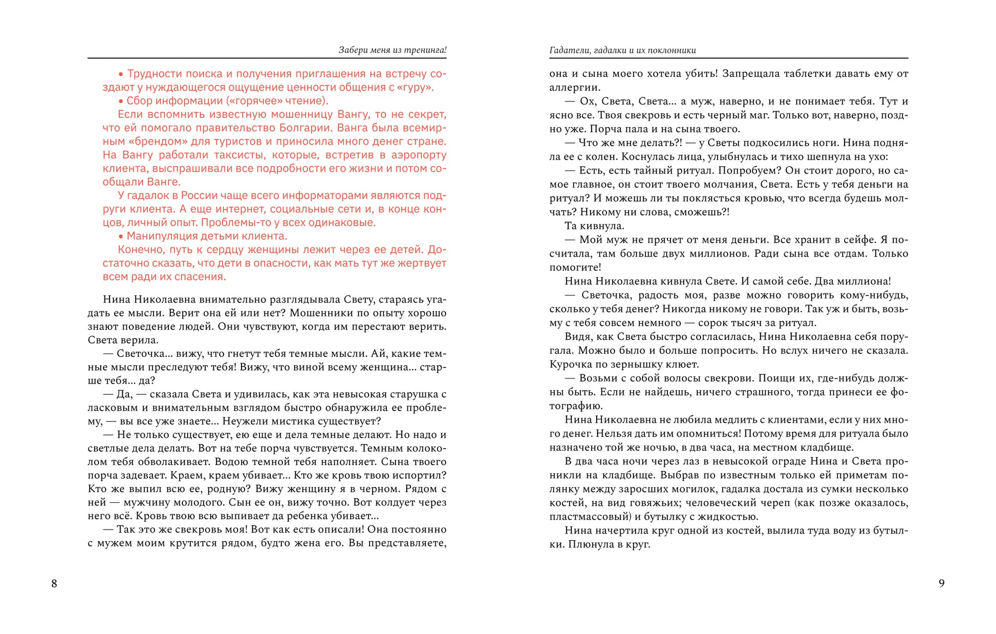 Большинство из нас не подозревают, что рядом могут находиться люди, которые пьют кровь, проводят ритуалы на кладбище, получают инструкции с Юпитера и развивают спиральные энергии. Нет, это не про мистику, ее здесь нет, просто эти несчастные попали в сети психокультов. В этой книге собраны реальные истории клиентов частного детективного Центра психологической безопасности о том, как обычные люди попадают в такую беду и чего стоит вытащить их из нее. Как семьи пострадавших сражаются с мошенниками или опускают руки, не в силах помочь близким. Попасть в секту или на опасный тренинг может абсолютно каждый, но есть способы распознать угрозу на дальних подступах и защитить себя и тех, кто нам дорог.