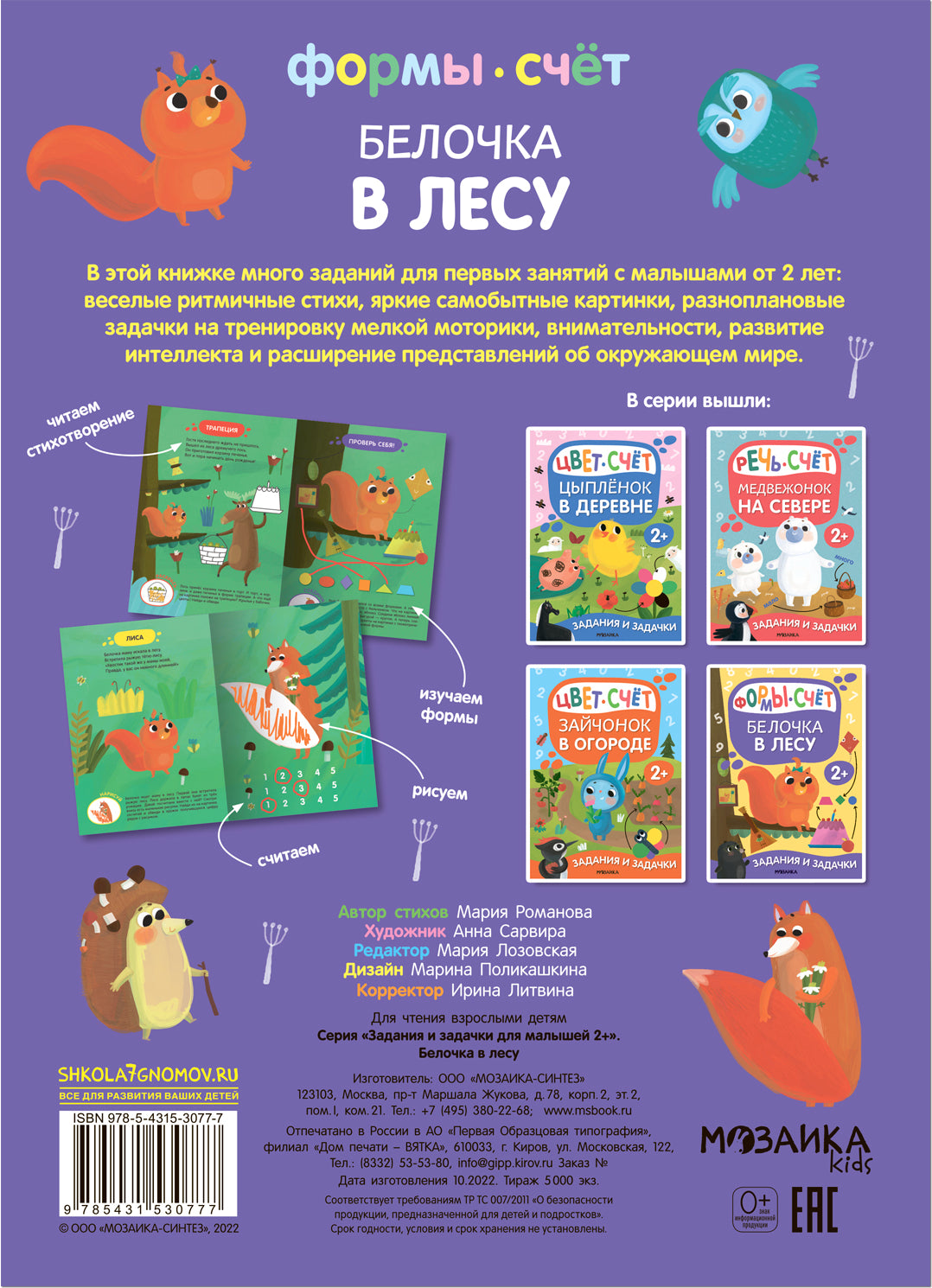 Белочка в лесу (Задания и задачки для малышей 2+) В книжке «Белочка в лесу» серии «Задания и задачки для малышей 2+» ребенок отправится в путешествие по лесу и познакомится с его обитателями, узнает, какие бывают формы, научится считать до 5, дорисует картинки, а также потренирует логику и воображение. А в конце книжки его ждет запутанный лабиринт!