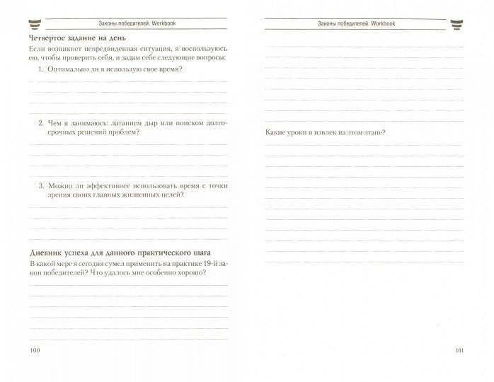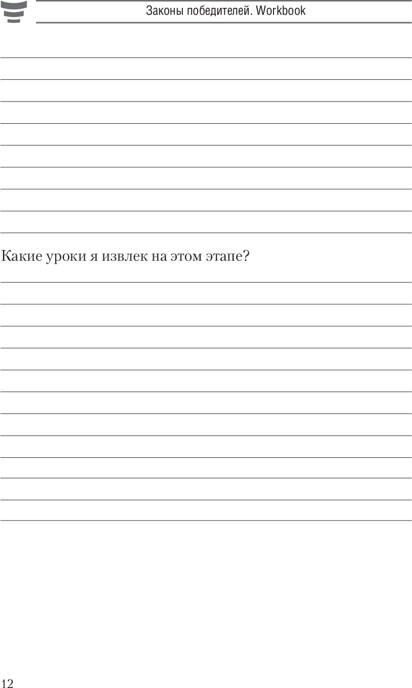 Специально для поклонников бестселлера "Законы победителей" Бодо Шефер разработал практическое пособие! Это полезное приложение к книге для выполнения ежедневных практических упражнений, демонстрирующих всю мощь тридцати законов в действии. Благодаря тренингу вы сможете выработать в себе привычки, которые автоматически приведут вас к успеху. Для каждого из тридцати законов разработаны соответствующие практические задания. Очень важно выполнять их в письменном виде, поэтому книга имеет форму рабочей тетради или ежедневника, где вы ведете записи. Все это поможет вам максимально эффективно адаптировать законы победителей к собственной жизни. Для широкого круга читателей.