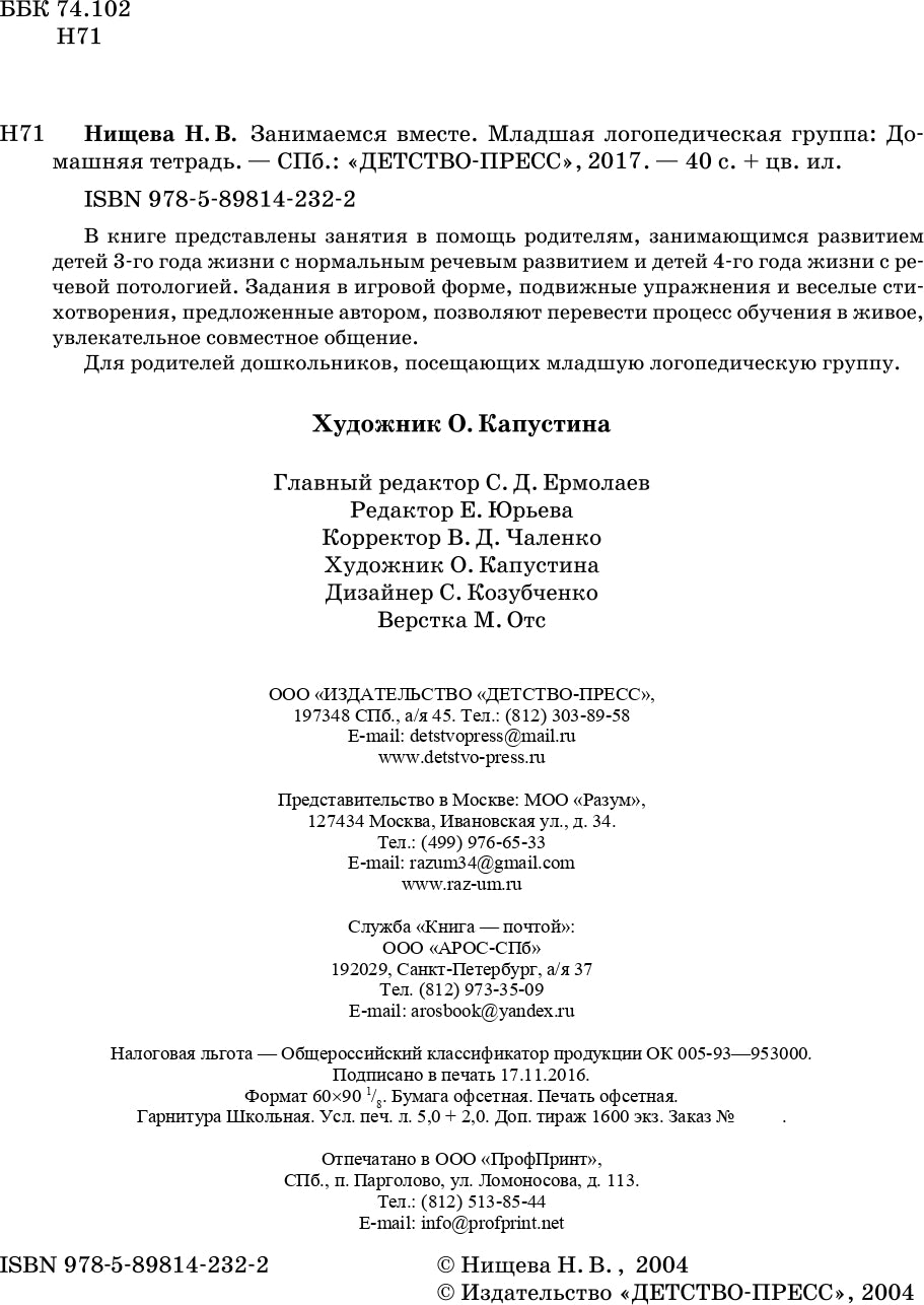 Handling time: 19 days Занимаемся вместе. Младшая группа компенсирующей направленности для детей с ТНР. Домашняя тетрадь. ФГОС. Нищева Н.В. В книге представлены методические рекомендации в помощь родителям, занимающимся развитием детей младшего дошкольного возраста (с 3 до 4 лет) с нарушенным речевым развитием или детей раннего дошкольного возраста (с 2 до 3 лет) с нормальным речевым развитием. Занимательные задания, подвижные упражнения, пальчиковая гимнастика, веселые стихотворения и яркие картинки позволяют перевести процесс обучения в живое общение с малышом. Для...