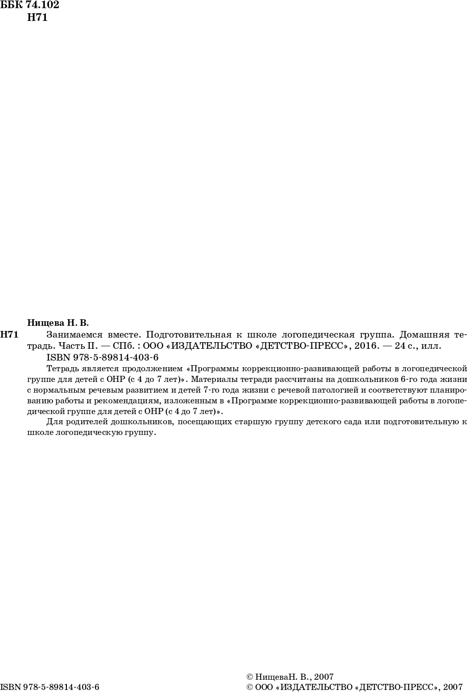Тетрадь является продолжением "Программы коррекционно-развивающей работы в логопедической группе для детей с ОНР (с 4 до 7 лет)". Материалы тетради рассчитаны на дошкольников 6-го года жизни с нормальным речевым развитием и детей 7-го года жизни с речевой патологией и соответствуют планированию работы и рекомендациям, изложенным в "Программе коррекционно-развивающей работы в логопедической группе для детей с ОНР (с 4 до 7 лет).