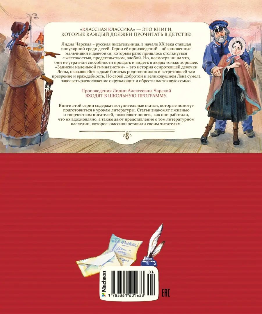 Handling time: 14 days Лидия Чарская - русская писательница, в начале XX века ставшая популярной среди детей. О том, что волнует юных читателей, она писала просто и увлекательно. Герои её произведений - обыкновенные мальчишки и девчонки, которым рано пришлось столкнуться с жестокостью, предательством, злобой. Но, несмотря ни на что, они не утратили способности прощать и видеть в людях только хорошее. "Записки маленькой гимназистки" - это история осиротевшей девочки Лены, оказавшейся в доме богатых родственников и встретившей там презрение и враждебность. Но своей добротой и великодушием Лена сумела завоевать расположение окружающих и обрести настоящую семью.Для среднего школьного возраста.
