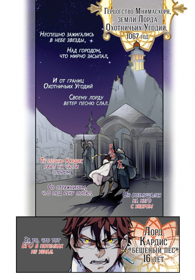 Handling time: 19 days (12+) Стихотворный сказ о гордом Лорде Кардисе “Бешеном Псе” и о страдающем от него окружении. В тихом уголке Лукоморья, в Мнимасхорне, занятная компания, скрывшись от глаз своего несколько неуравновешенного Лорда, развернула карточную игру. Среди игроков оказалась и прекрасная иностранка Эра, что попала в угодья Лорда не по своей воле. За игрой разговоры зашли в обсуждение Лорда. И как выяснилось, многие из присутствующих оказались здесь также не по собственному желанию. Настало время узнать историю одного из бедолаг – Хриза. С чего все началось, и почему он до сих пор не сбежал?