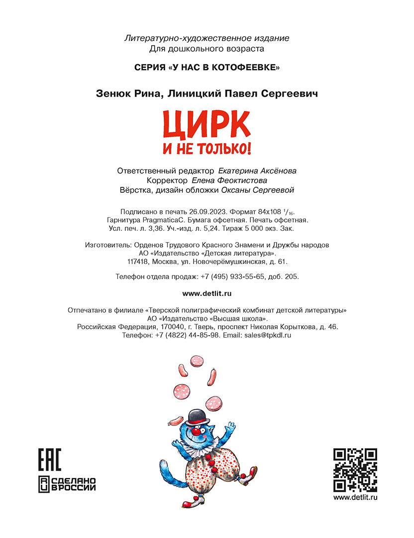 Handling time: 25 days (0+) В Котофеевке настоящее событие — приезжает цирк! Невероятное представление, мировые звёзды, шоу, которое перевернёт с нижних лап на верхние всех жителей! И как вы думаете, кто в центре событий? Конечно, Федя, Вася и Тося! Ни много ни мало, они решаются на побег с цирком! Что может быть прекраснее, чем судьба настоящего артиста? Приключения начинаются!