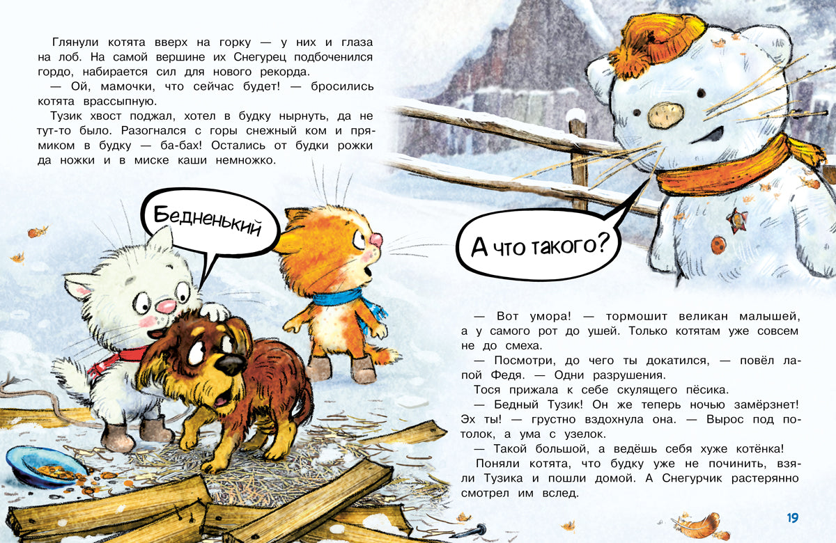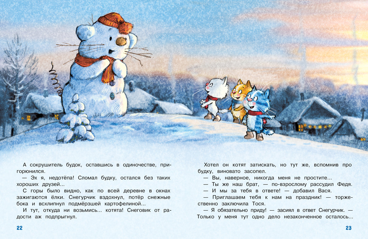 Handling time: 19 days (0+) Накануне Нового года в Котофеевке произошли загадочные события. Сначала гром и молния в зимнем небе. Затем Федя, Вася и Тося устроили погром во дворе тётки Обжорихи. Впрочем, это ещё можно объяснить. Читатели знают, что наша дружная троица любит шалить. А вот снежный гость к праздничному столу — это, пожалуй, станет событием года.