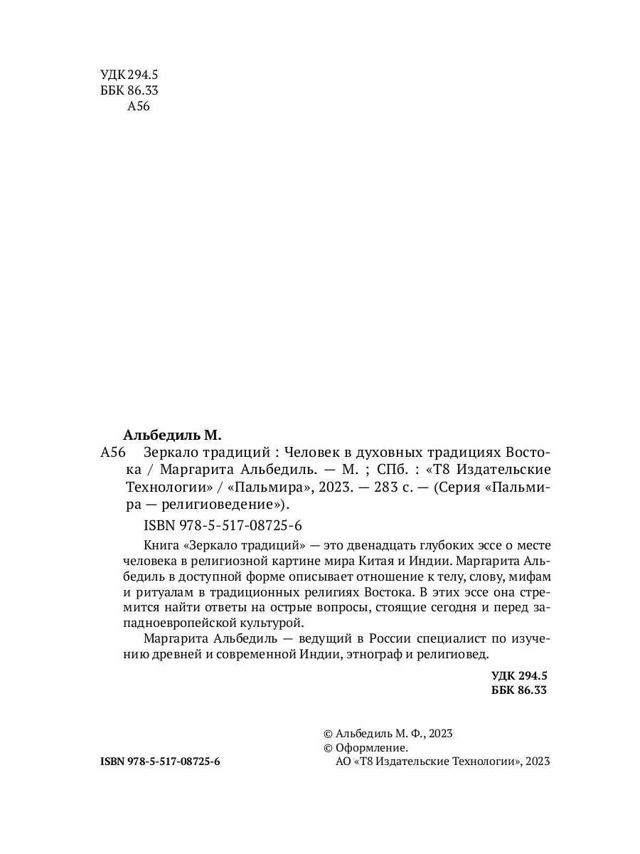 Handling time: 14 days Автор: Альбедиль Маргарита, «Зеркало традиций: Человек в духовных традициях Востока»: Маргарита Альбедиль — ведущий в России специалист по изучению древней и современной Индии этнограф и религиовед, доктор исторических наук. Она автор более 250 научных и научно-популярных работ о традиционных восточных религиях. «Зеркало традиций» — 12 глубоких эссе о месте человека в религиозной картине мира Китая и Индии. Маргарита Альбедиль в доступной форме описывает отношение к телу, слову, мифам и ритуалам в традиционных религиях Востока. В этих эссе она стремится найти ответы на острые вопросы, стоящие сегодня и перед западноевропейской культурой. «Встреча Востока и Запада, которая происходит на наших глазах, — не просто дань бездумной моде. Она ставит обе стороны перед необходимостью пересмотреть свои стереотипы и привычки. И самое главное — пересмотреть образ человека».
