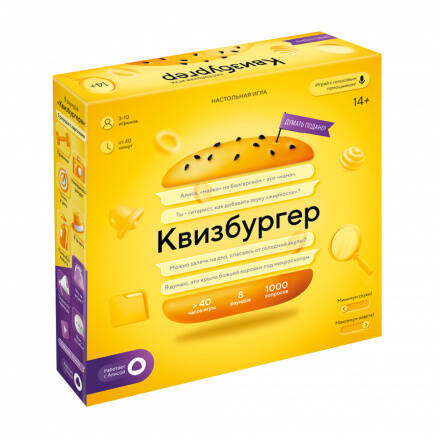 Handling time: 14 days Большая настольная игра для любителей вкусных вопросов и жарких поединков! Вас ждёт 8 раундов, включая раунды с голосовым помощником Яндекса - Алисой. Приготовьтесь вспомнить всё, что знаете, и открыть для себя много нового и интересного. Вам понадобятся: эрудиция, логика, интуиция и, конечно, нестандартное мышление! Думать подано - попробуйте знания на вкус!>40 часов игры8 раундов1000 вопросовКоличество игроков: 3-10.Время игры: от 40 минутВозраст: 14+В наборе: игровое поле 34х34 см, карточки 6,5х9,5 см -269 штук, планшет 20х24 см, блок для записей - 50 листов 8х12 см, маркер на водной основе, правила игры.Материалы: бумага, картон, пластмасса.