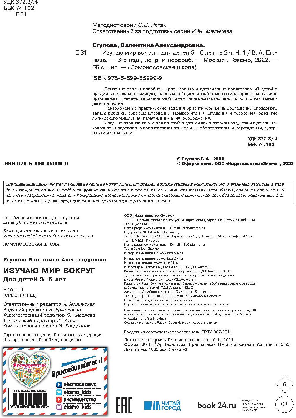 Основные задачи пособия - расширение и детализация представлений детей о предметах, явлениях природы, человеке, общественной жизни и формирование навыков правильного поведения в социальной среде, бережного отношения к богатствам природы и общества.Разнообразные практические задания ориентированы на обогащение словарного запаса ребенка, совершенствование навыков чтения, слушания и говорения, развитие логического мышления, памяти, внимания, воображения.Издание предназначено для занятий с детьми (как в детском саду, так и в домашних условиях) и адресовано воспитателям дошкольных образовательных учреждений, гувернерам и родителям.3-е издание, исправленное и переработанное.