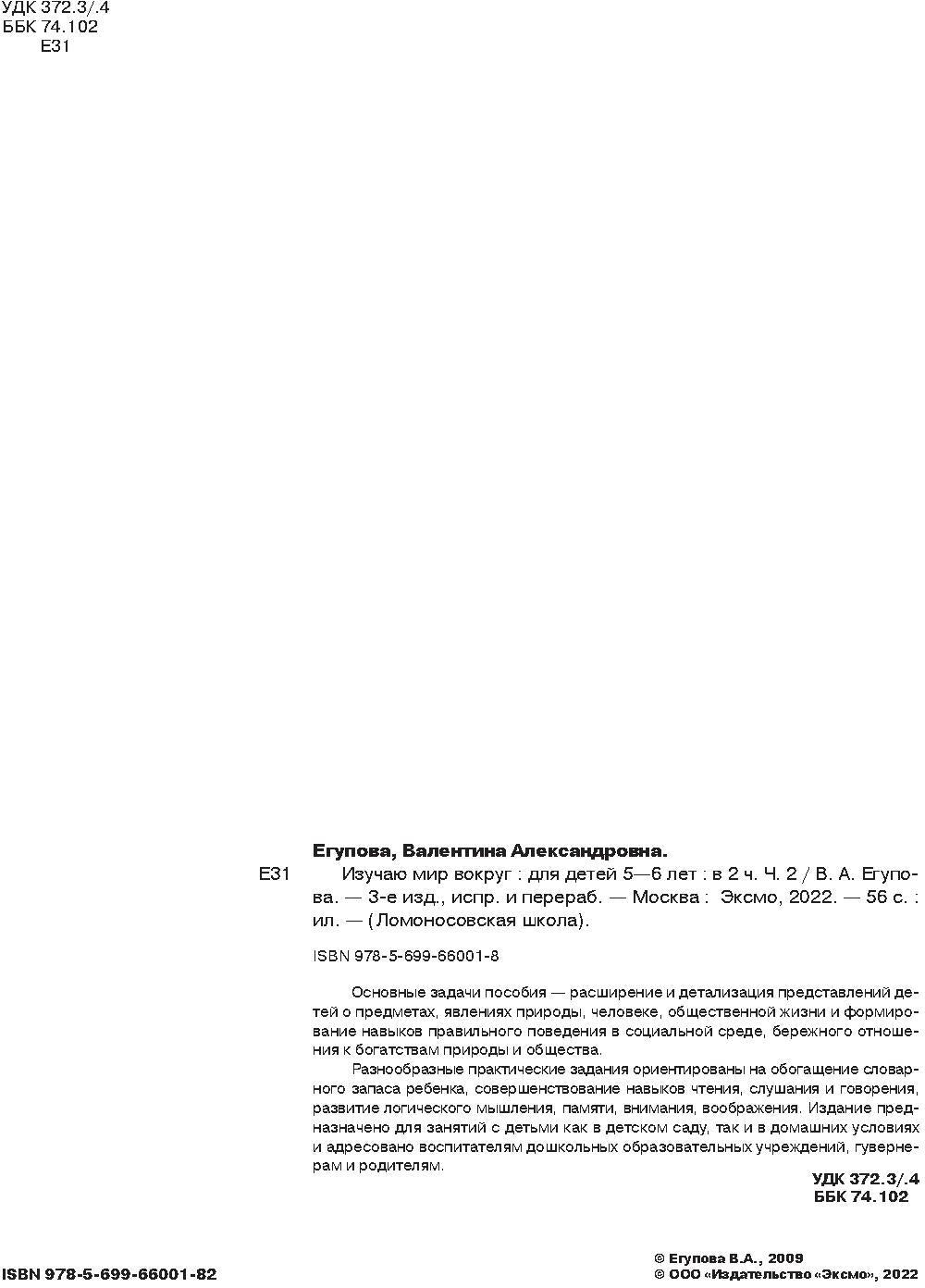 Основные задачи пособия - расширение и детализация представлений детей о предметах, явлениях природы, человеке, общественной жизни и формирование навыков правильного поведения в социальной среде, бережного отношения к богатствам природы и общества. Разнообразные практические задания ориентированы на обогащение словарного запаса ребенка, совершенствование навыков чтения, слушания и говорения, развитие логического мышления, памяти, внимания, воображения. Издание предназначено для занятий с детьми (как в детском саду, так и в домашних условиях) и адресовано воспитателям дошкольных образовательных учреждений, гувернерам и родителям.Для чтения взрослыми детям.3-е издание, исправленное и переработанное.