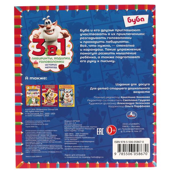 Развивающая книга 3 в 1 «Буба. Истории непосед» ТМ «УМка» станет прекрасным подарком для ребёнка:- лабиринты- ходилки- головоломки- интересный дизайн- любимые персонажиМаленький любознайка с удовольствием будет заниматься с этой красочной книгой-ак