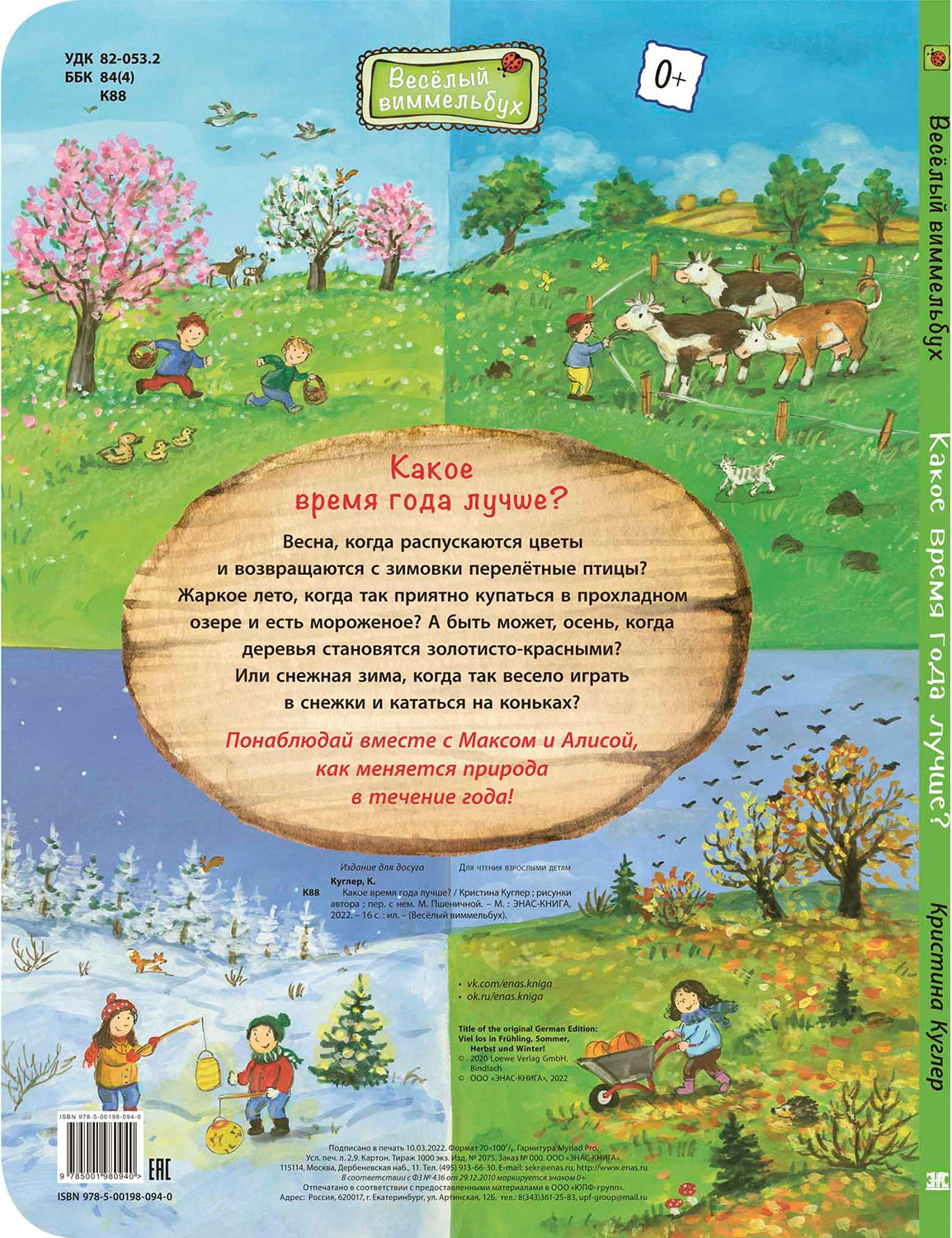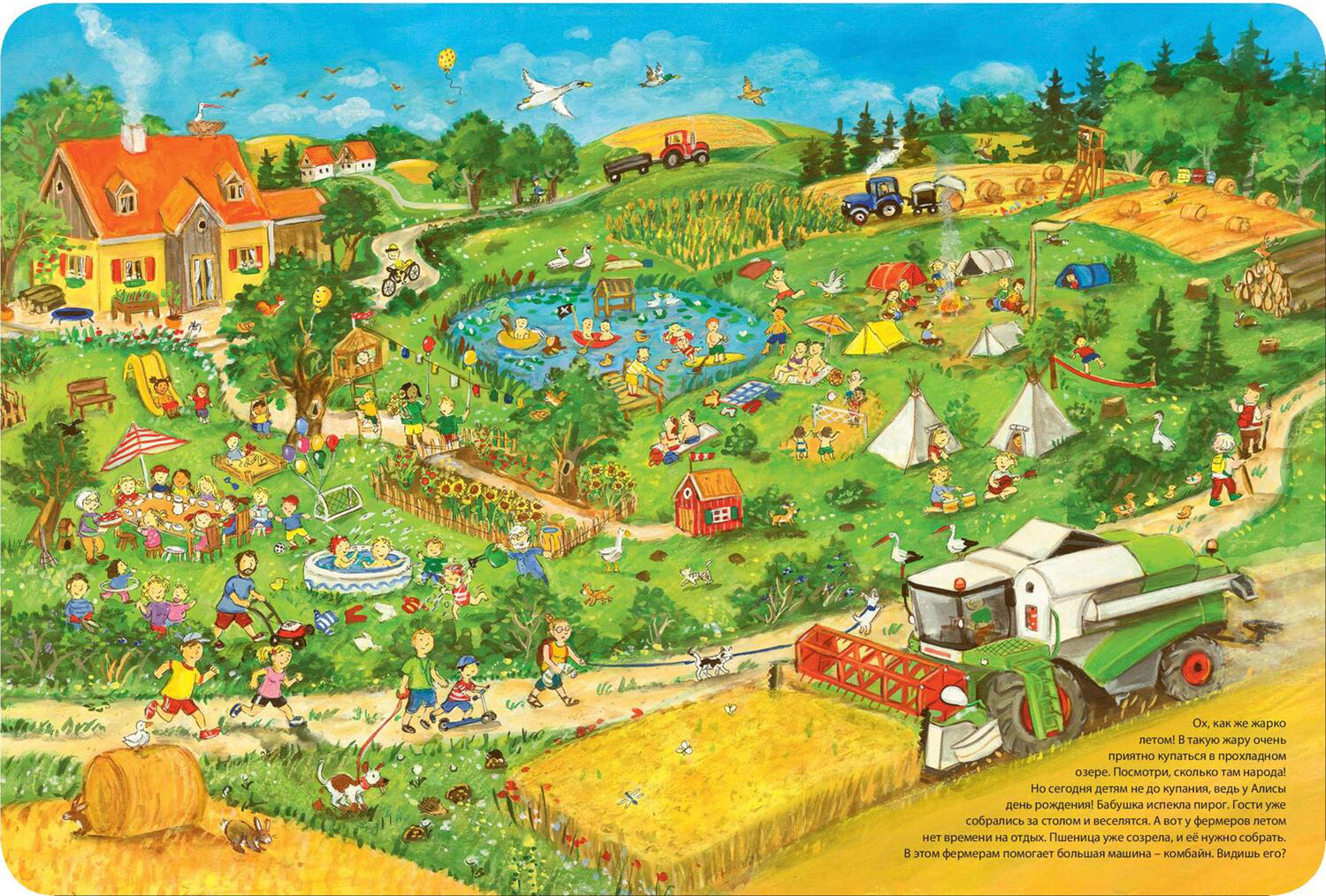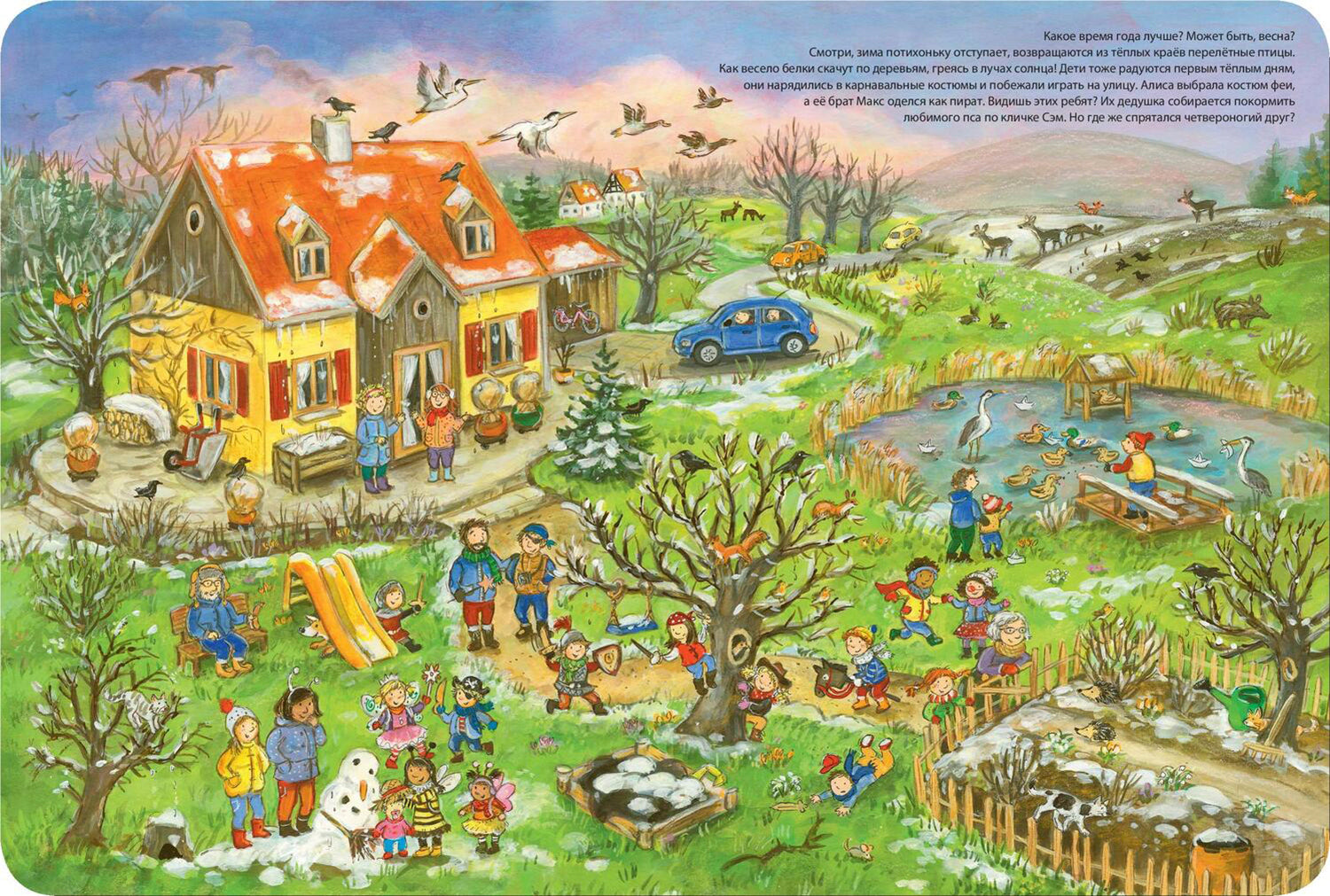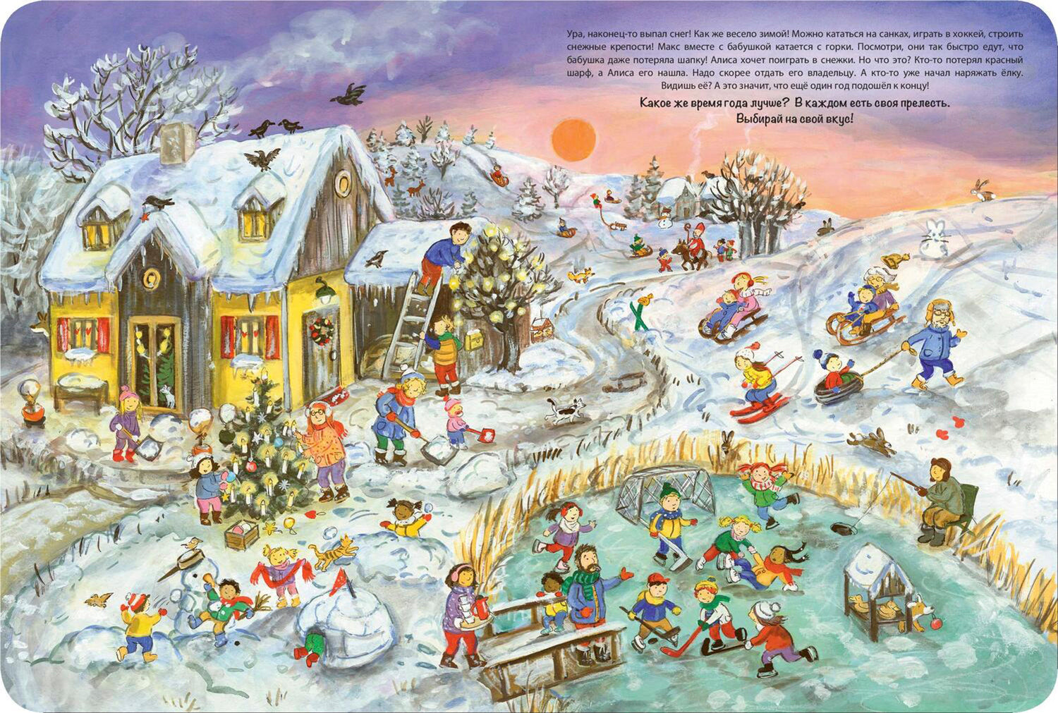 Какое время года лучше? Весна, когда распускаются цветы и возвращаются домой перелетные птицы? Жаркое лето, когда так приятно купаться в прохладной воде и есть мороженое? А может быть, осень, когда деревья становятся золотыми и красными? Или снежная зима, когда так весело играть в снежки и кататься на коньках? Понаблюдай вместе с Алисой и ее братиком Максом, как меняется природа в течение года. А заодно разгляди на картинках множество интересных деталей и забавных персонажей.Книга большого формата, напечатана на плотном картоне.Для чтения взрослыми детям.